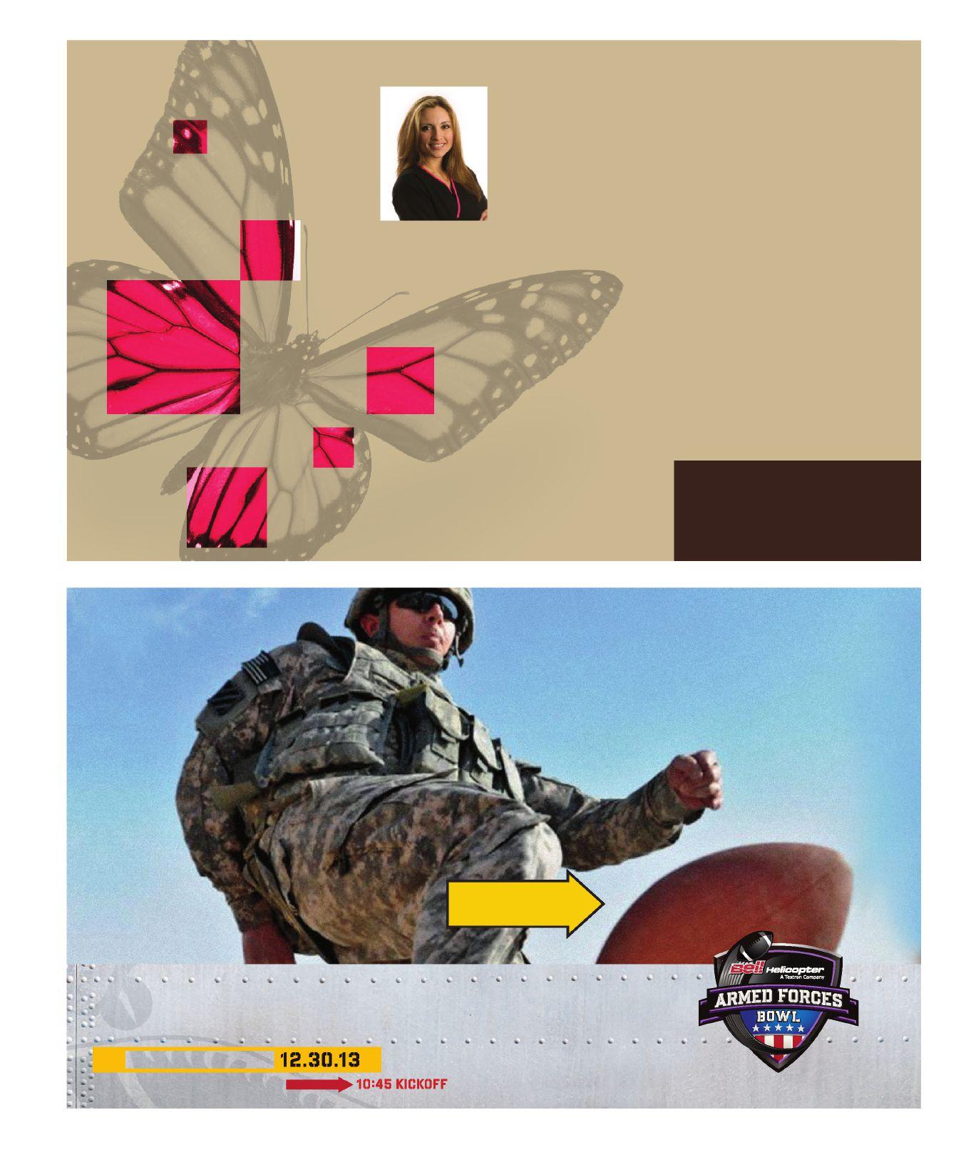 The 2013 Bowl should be no different, says Brant Ringler, Bell Helicopter Armed Forces Bowl executive director. “There will be vintage Jeeps on display, a special veteran’s tailgate area, interactive booths representing the different branches of our armed services, and over 100 Patriot Guard motorcycles on display.”
