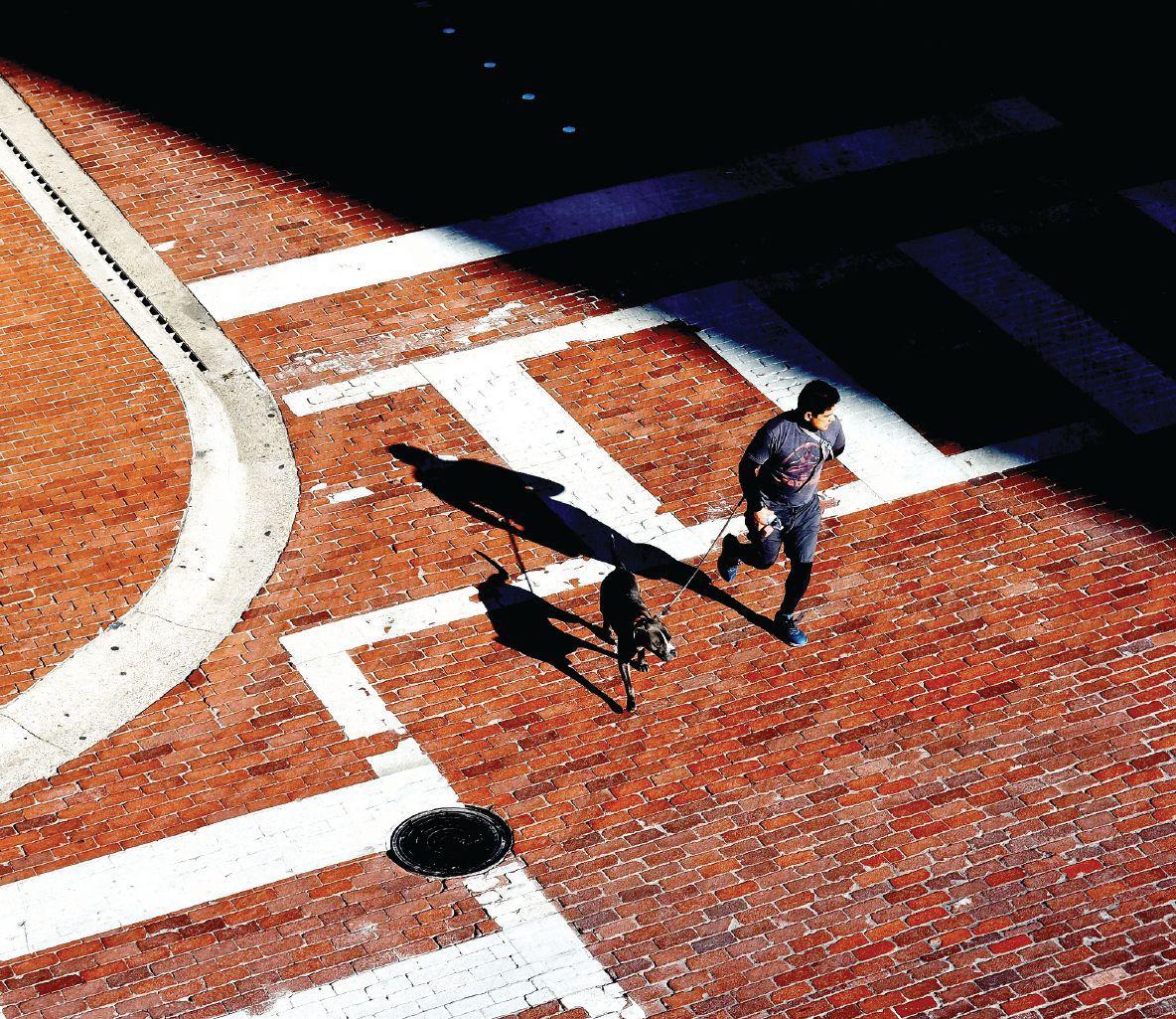 » “I am always on the lookout for shape, angles of shadows, light, and how people interact with it. On this particular day, I was walking up to the corner of Sixth and Main streets. I could see the sun shining through two buildings from the east, casting shadows on the street. From eye level nothing really stood out; then I noticed a parking garage above that gave a clear vantage point of the streets below … For me, the light is what speaks the most. I’m drawn to capture regular, pedestrian moments but framed by high contrasts of light and shadow. It invites the eyes to linger and study a moment in time they would otherwise have forgotten.”