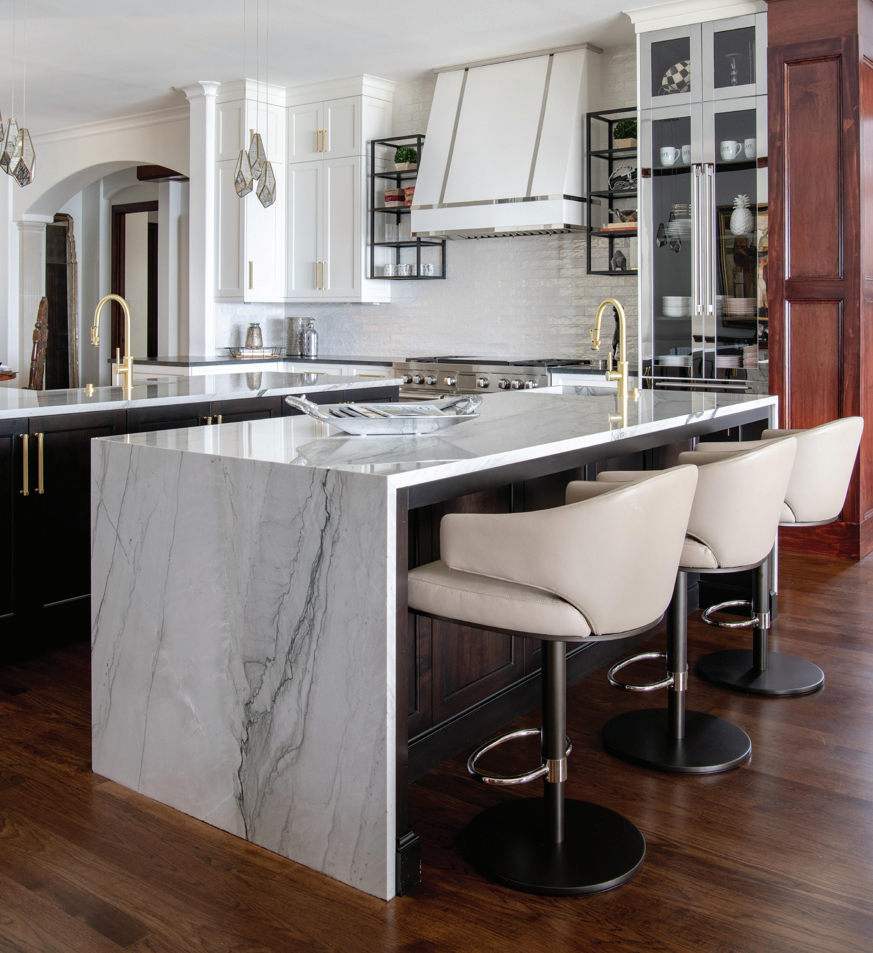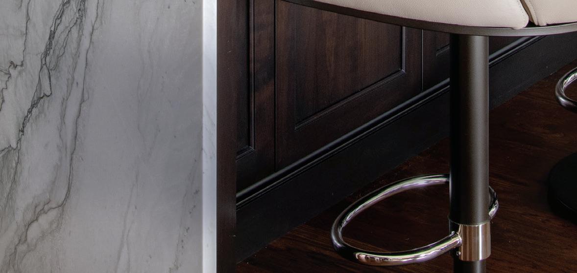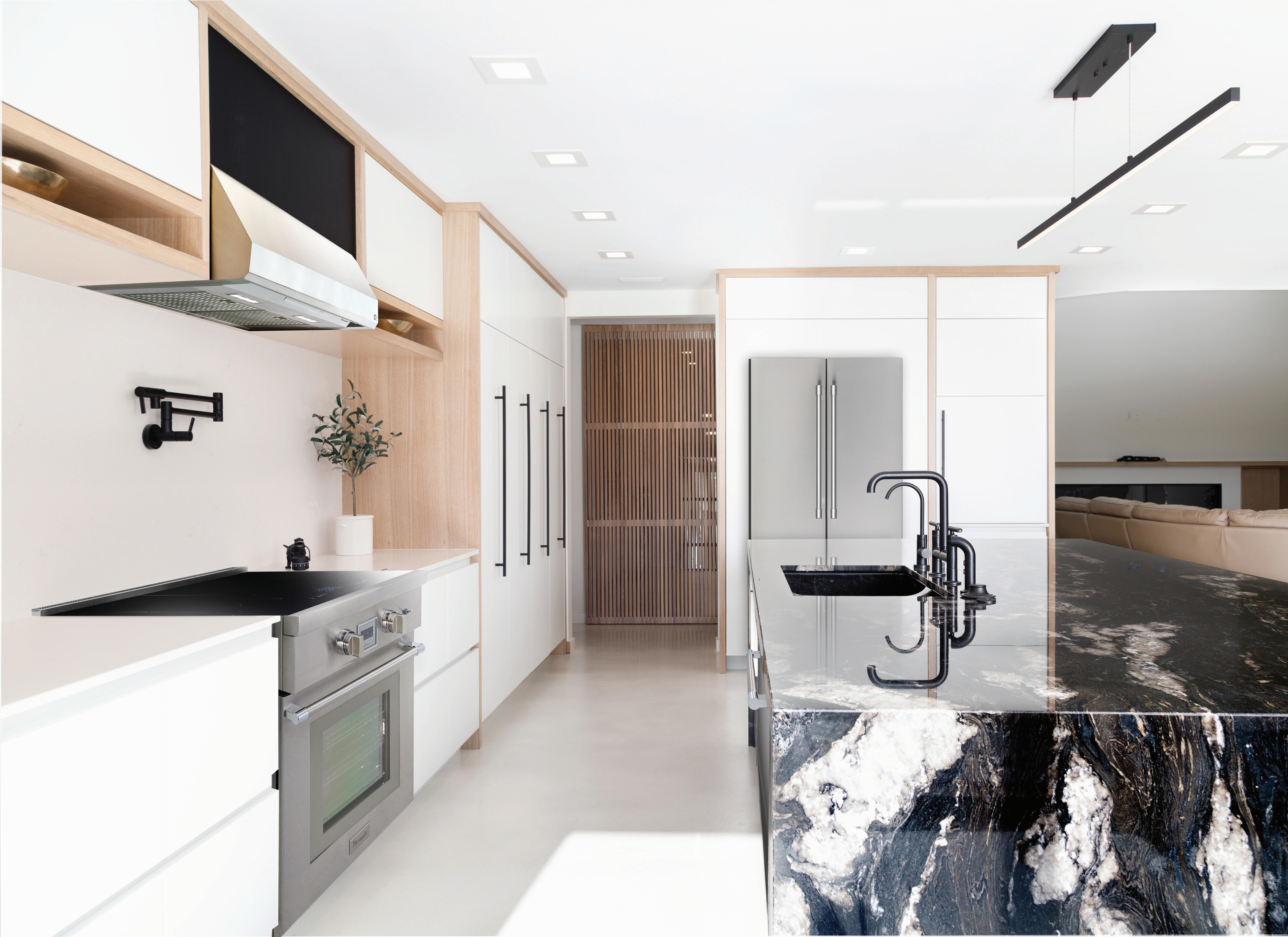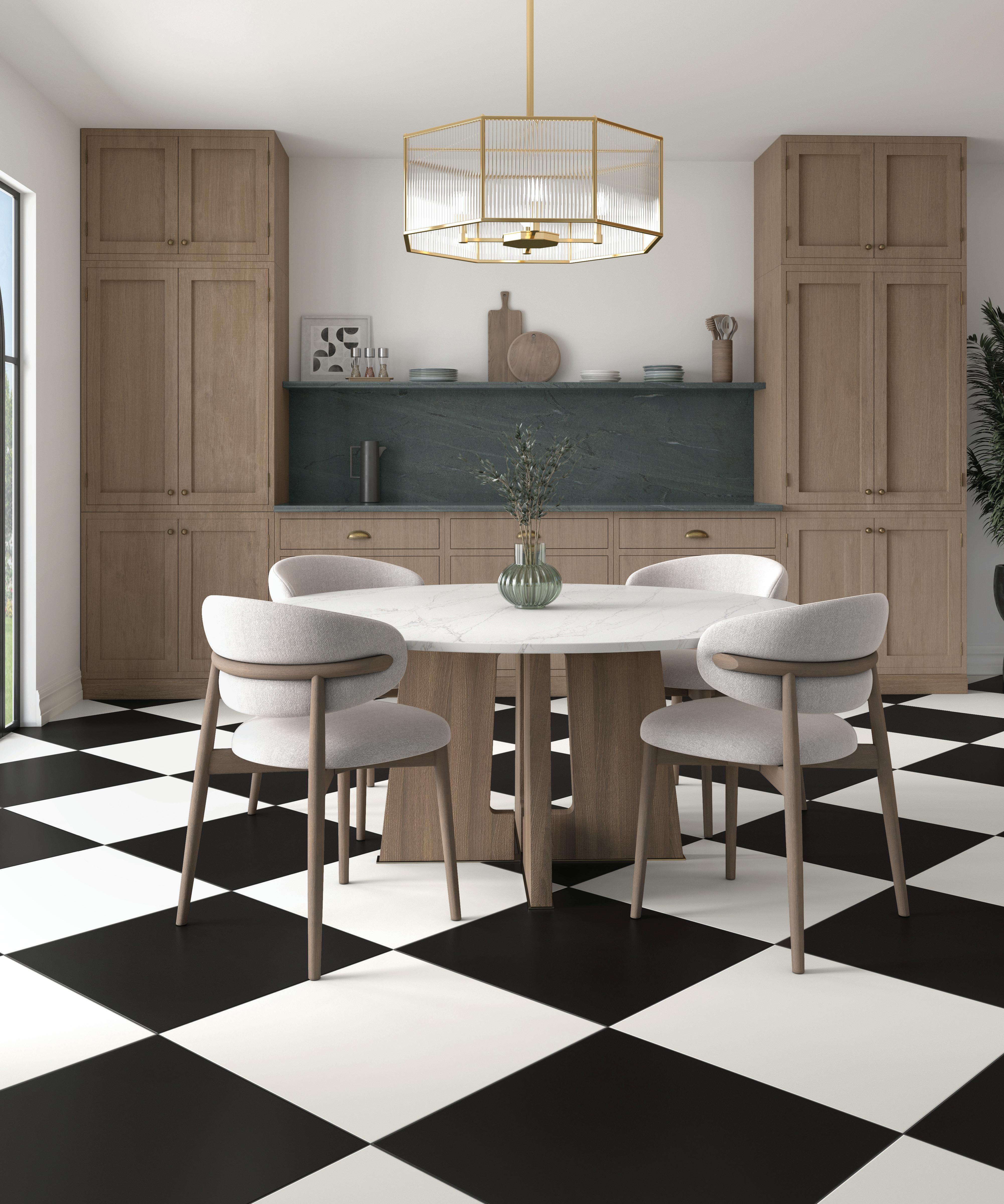 Photo features Pure™ Black and Frost White on the floor. With Natural Stone Slab Black Soapstone on the countertop and backsplash.