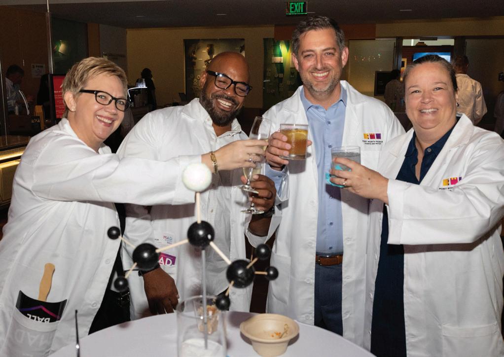 The 2023 Mad Scientist Ball, held on Sept. 29, proved to be a mesmerizing chemistry experiment of celebration, innovation, and community support. The evening commenced with a tantalizing taste of Fort Worth, showcasing culinary delights from outstanding local restaurants: Bob’s Steak and Chop House Fort Worth, Blue Bell Creameries, Chill-N Nitrogen Ice Cream Fort Worth, DeLucca Gaucho Pizza & Wine, Enchiladas Ole, Fitzgerald, Galligaskins & Fort Worth Catering, Heim Barbecue, Magdalena’s Catering and Events, Prince Lebanese Grill, Reata Restaurant, and Taco Heads. Mentalist Anthony Dempsey and musician Andrew Sullivan wove magic throughout the entire event. Lockheed Martin’s flight simulator provided a thrilling adventure akin to molecular collisions followed by an engaging silent and live auction hosted by Davis Auctioneers.