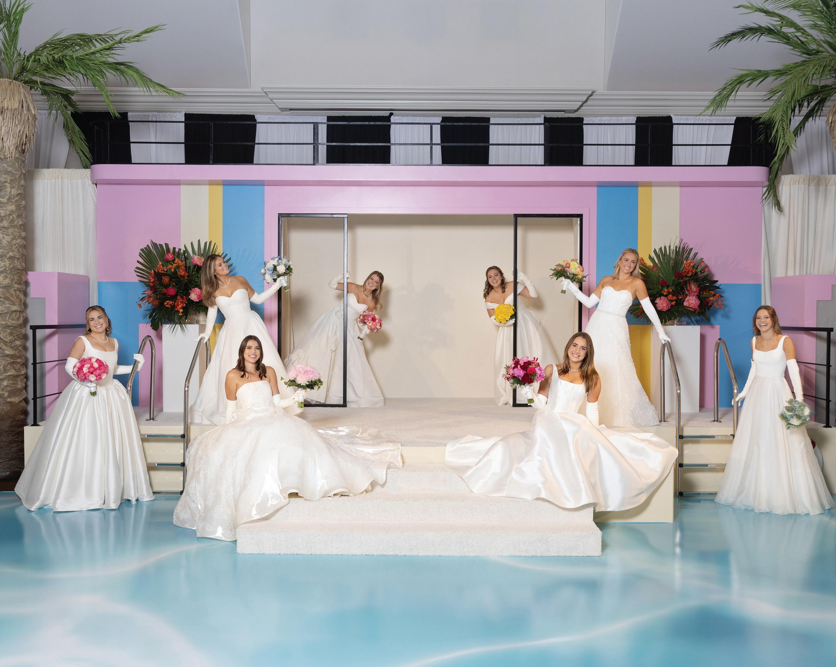 with oversized Steeplechase Officer posters emulating Rat Pack iconic and vintage photos adjacent to the original Rat Pack photos. Upstairs, the focus in the ballroom was a unique stage set, modeled as a midcentury modern pool house complete with swim ladders and life rings. As each Debutante completed her bow, she glided down the steps from the pool house onto a dance floor mimicking the soft blue tones of a virtual pool. Post-breakfast entertainment,