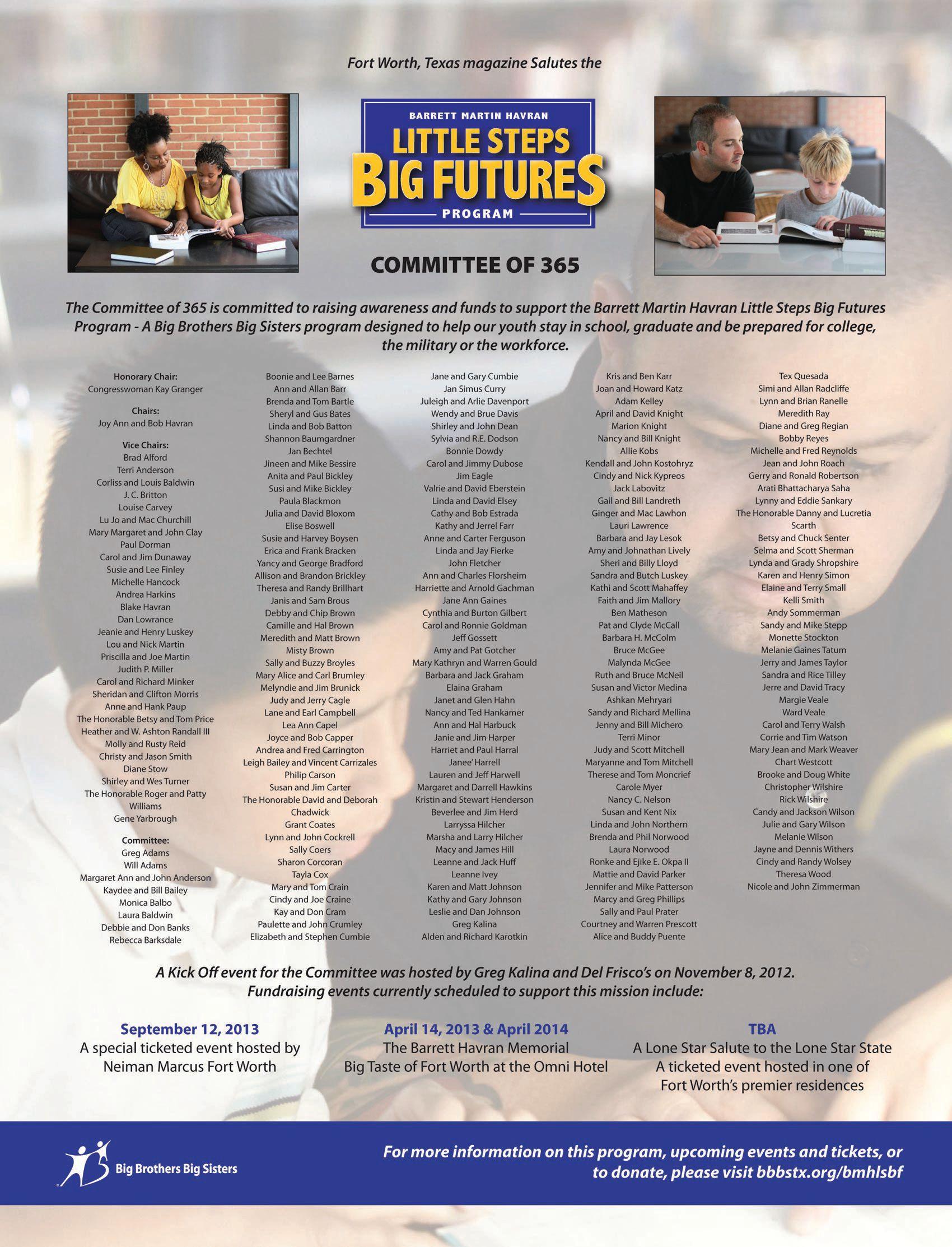 Just a quick note to thank everyone for the wonderful story in the December issue (See: December 2012, The Gift of Giving, page 78). Just got back in town and this is the first time I have seen it. Feedback has been great! When I look at all of the good work horsepower represented in the photo,it moves me. Your magazine – all aspects (writing, topics, production) – is top shelf and an asset to the Fort Worth community.