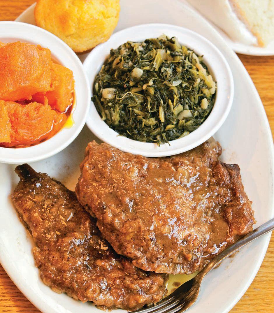 Among the soulful dishes at Drew's Place, the smothered pork chops is one of the house specialties and is served with candied yams and collard greens.