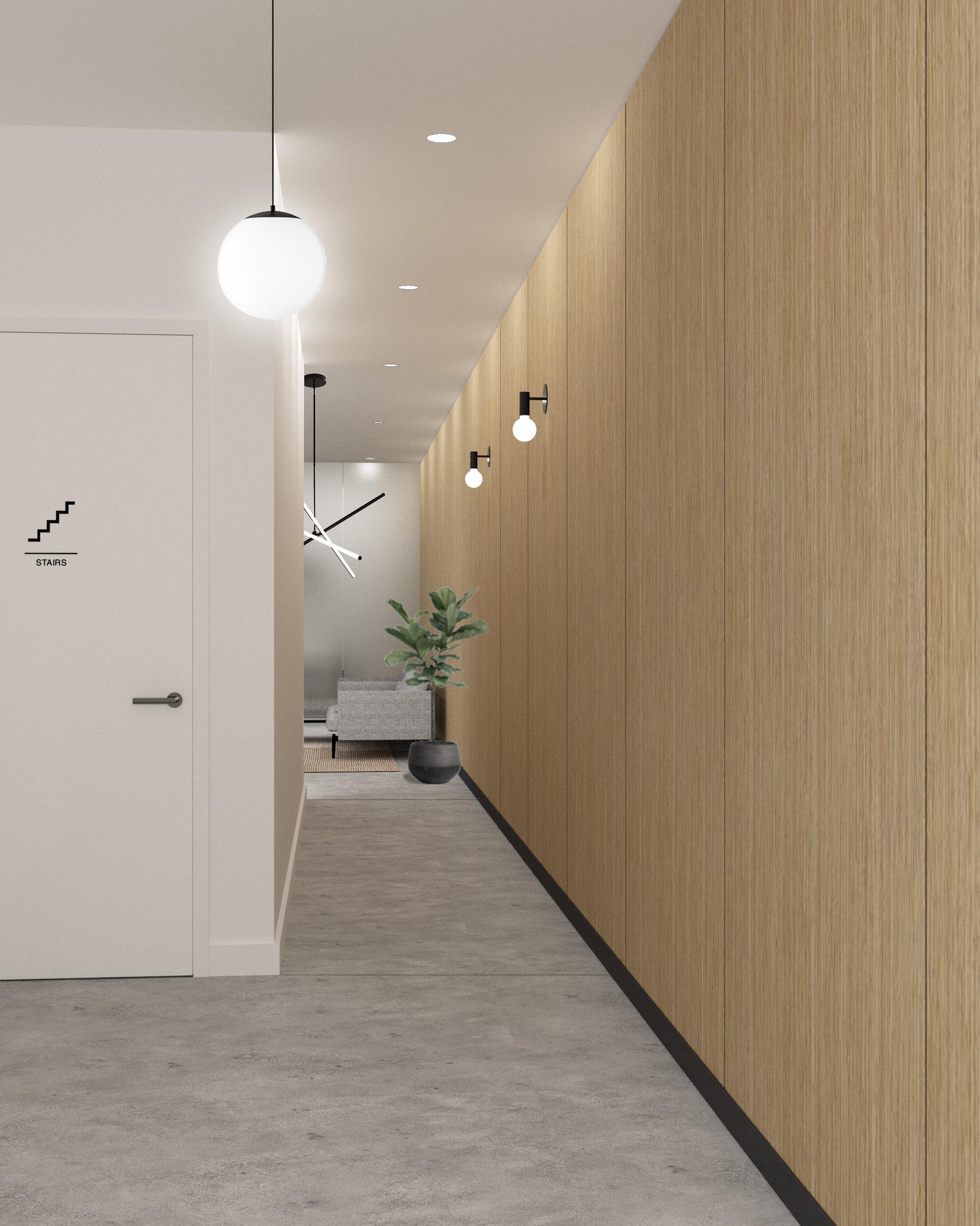 6'-8" C L 9'-3" VIF 1'-0" Polished Concrete Floor Wood Veneer Wall Panel Eggshell White Paint Black Decorated Lighting Fixture / Hardware Grey Laminate Pntd. White Baseboard Bosco 12