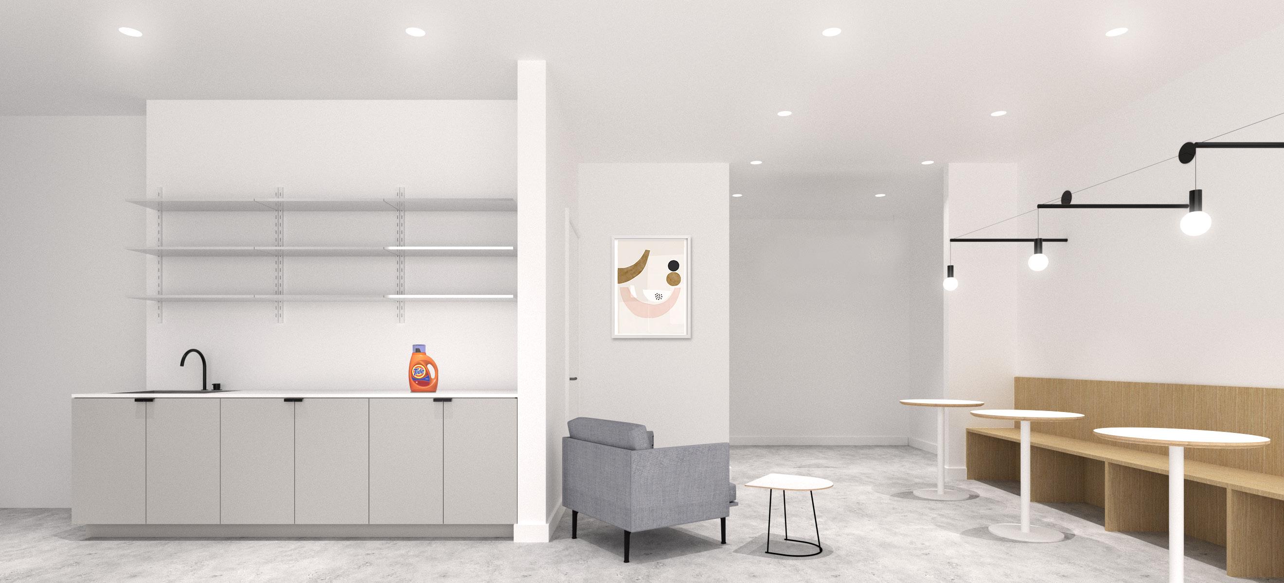 Louge - Plans + Elevations 4" 2'-10" 2'-0" 1'-0" 1'-0" 3'-0" 1'-6" 6'-8" C L 9'-3" VIF 1'-0" Polished Concrete Floor Wood Veneer Wall Panel Eggshell White Paint Black Decorated Lighting Fixture / Hardware Grey Laminate Pntd. White Baseboard Material Palette & Proposed Laundry Lounge Elevation
