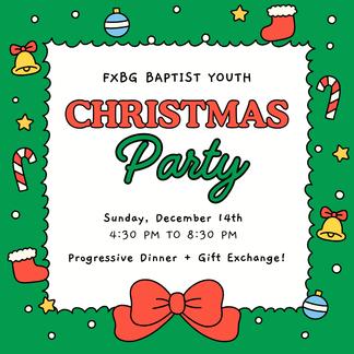 All youth (7th-12th grade) are invited to a Progressive Dinner and Gift Exchange! We’ll enjoy appetizers at the McGlones’, dinner at the Overbys’, and dessert and a gift exchange at the Stewarts’. Bring a wrapped gift (under $15, no gift cards) and wear your best Christmas attire! For more information & to RSVP, scan the QR code Contact Beth Bailey at beth@fxbgbaptist org for more details