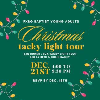 All young adults (college students included) are invited to celebrate the season with a Tacky Light Tour in Richmond! Join Beth and Colin Bailey as we meet at the church parking lot by 4 pm to head to RVA for dinner at ZZQ and a tour of holiday lights We’ll return around 9:30 pm Bring snacks, drinks (non-alcoholic only), and wear your best Christmas gear! RSVP at the QR code by Dec 18th