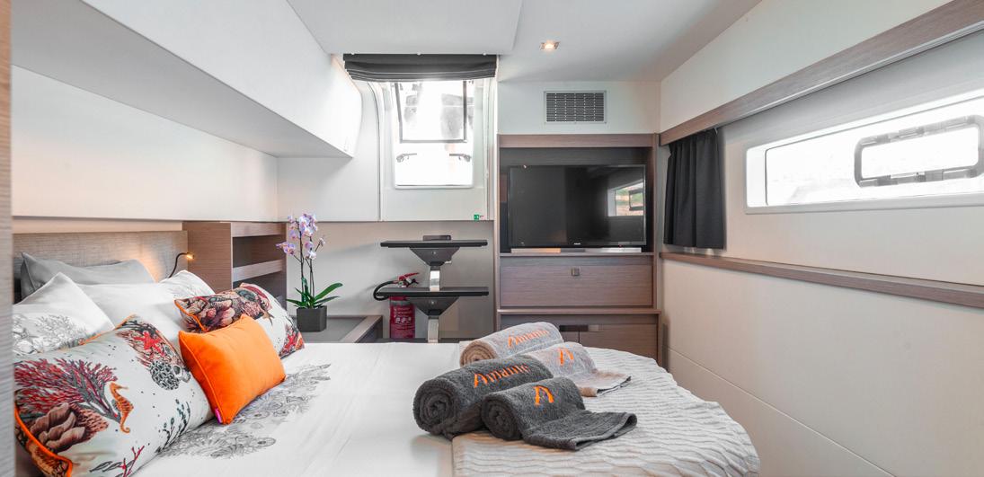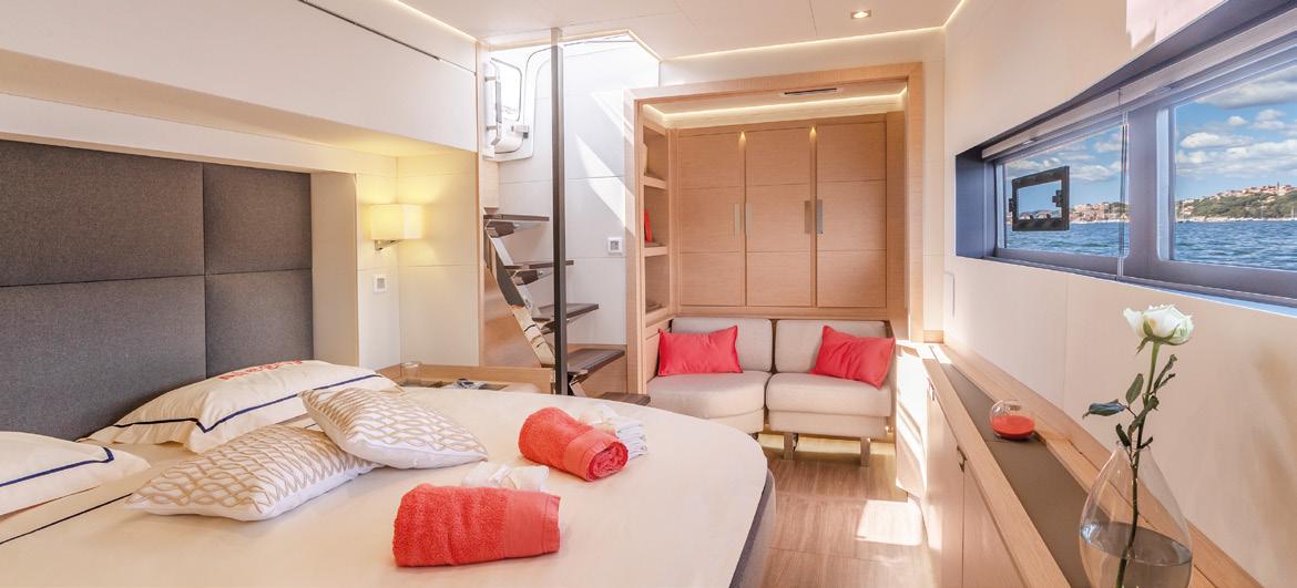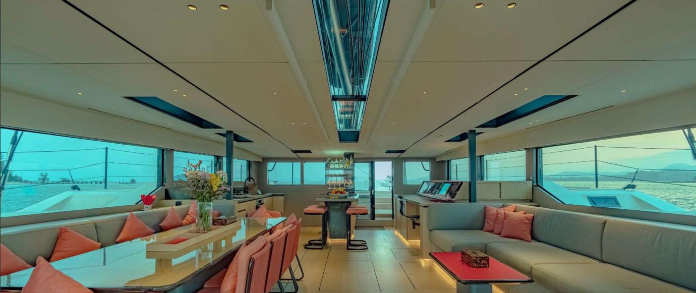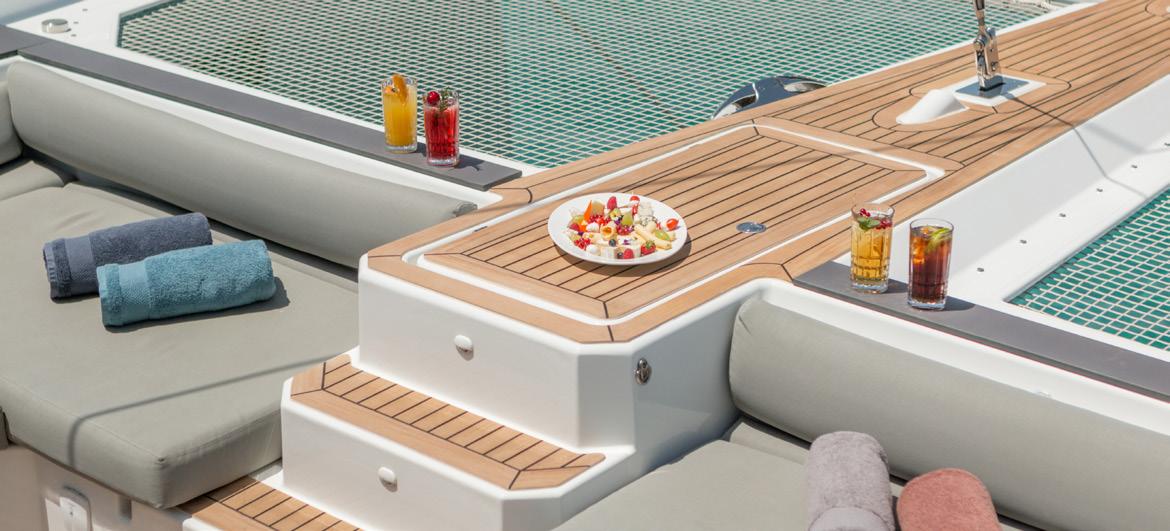 Step inside and be wowed by her spacious 9.3m beam, chic open-plan saloon, deluxe dining area, and walk-around bar. Outside, lounge on the forward sun pads, sip cocktails on the aft deck, and soak up the sun in total comfort.