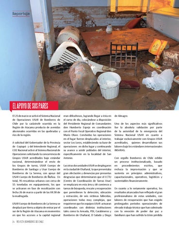 EL APOYO DE SUS PARES El 25 de marzo se activó el Sistema Nacional de Operaciones USAR de Bomberos de Chile por la catástrofe ocurrida en la Región de Atacama producto de avenidas aluvionales ocurridas en las quebradas y ríos de la región. A solicitud del Gobernador de la Provincia de Copiapó y del Intendente Regional, el COE Nacional activó al Sistema Nacional de Operaciones solicitando la concurrencia de Grupos USAR acreditados bajo estándar nacional, determinándose el envío de los Grupos de turno, USAR Cuerpo de Bomberos de Santiago y Usar Cuerpo de Bomberos de La Serena, con apoyo del USAR Cuerpo de Bomberos de Ñuñoa. En total, 95 rescatistas urbanos con cerca de 15 toneladas en equipamiento, los que se activaron en fase de movilización con fecha 26 de marzo a partir de las 04:30 de la madrugada. USAR Cuerpo de Bomberos de La Serena se desplazó por tierra a objeto de entrar por el sur de la Región de Atacama en momentos en que los accesos a la capital regional