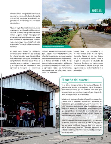 El sueño del cuartel En el último tiempo la Quinta Compañía del Cuerpo de Bomberos de Maullín ha conseguido crecer de manera invaluable. Ellos saben que han hecho las cosas bien, que los proyectos se han cumplido y es por ello que el sueño de tener un nuevo cuartel no lo ven lejano. Actualmente las dependencias del cuartel son pequeñas. Cuentan con lo necesario, no obstante, no tienen las instalaciones para establecer una guardia nocturna. En estos momentos es imposible para ellos organizar una, porque no tienen las comodidades ni el espacio para que los voluntarios duerman ahí. Es su sueño tener una guardia nocturna, tal como lo tienen muchos Cuerpos de Bomberos a lo largo del país. Los voluntarios esperan que no haya demora en conseguir los fondos necesarios para llevar a cabo el proyecto, y que una buena gestión de ellos será clave en el proceso, más el respaldo del respectivo Cuerpo de Bomberos, las autoridades correspondientes y la comunidad que siempre los han apoyado. VERANO 2017