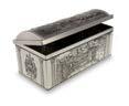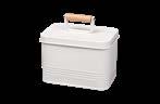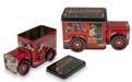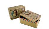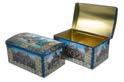 Sonderform Korb; Rechteckige Stülpdeckeldose mit Henkel aus elektrolytischem Weißblech; bedruckt