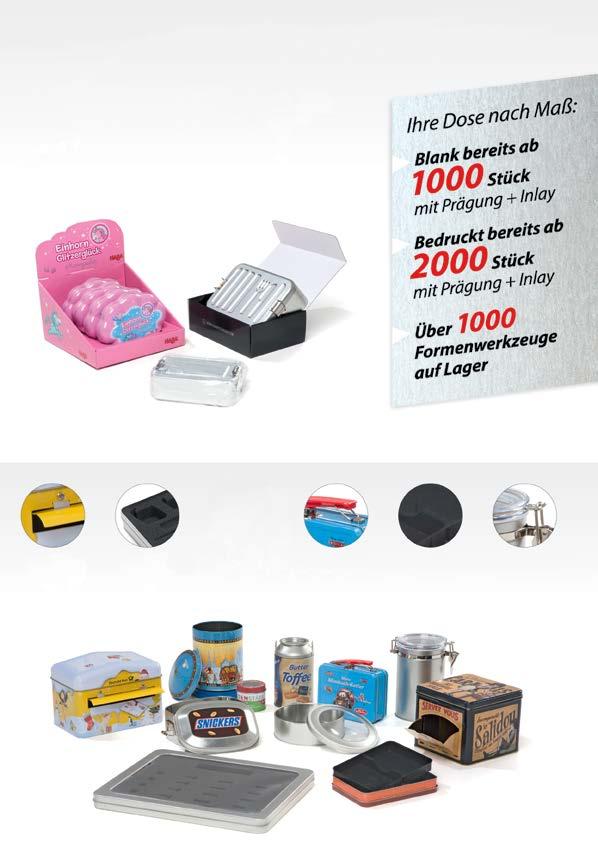 Folien- und Kartonverpackungen Passende Displays Ihre Dose nach Maß Blank bereits ab 1000 Stück mit Prägung+Inlay Bedruckt bereits ab 2000 Stück mit Prägung+Inlay Über 2000 Formenwerkzeuge auf Lager