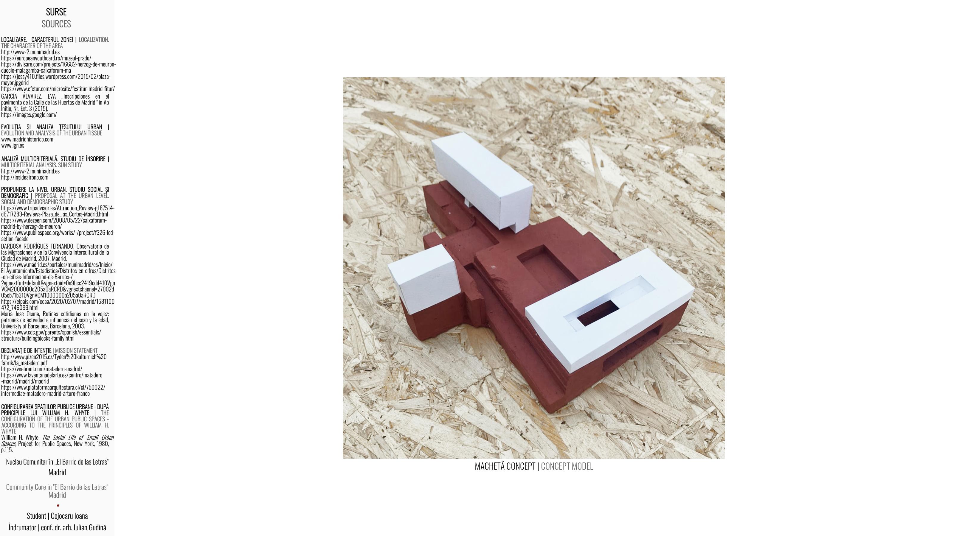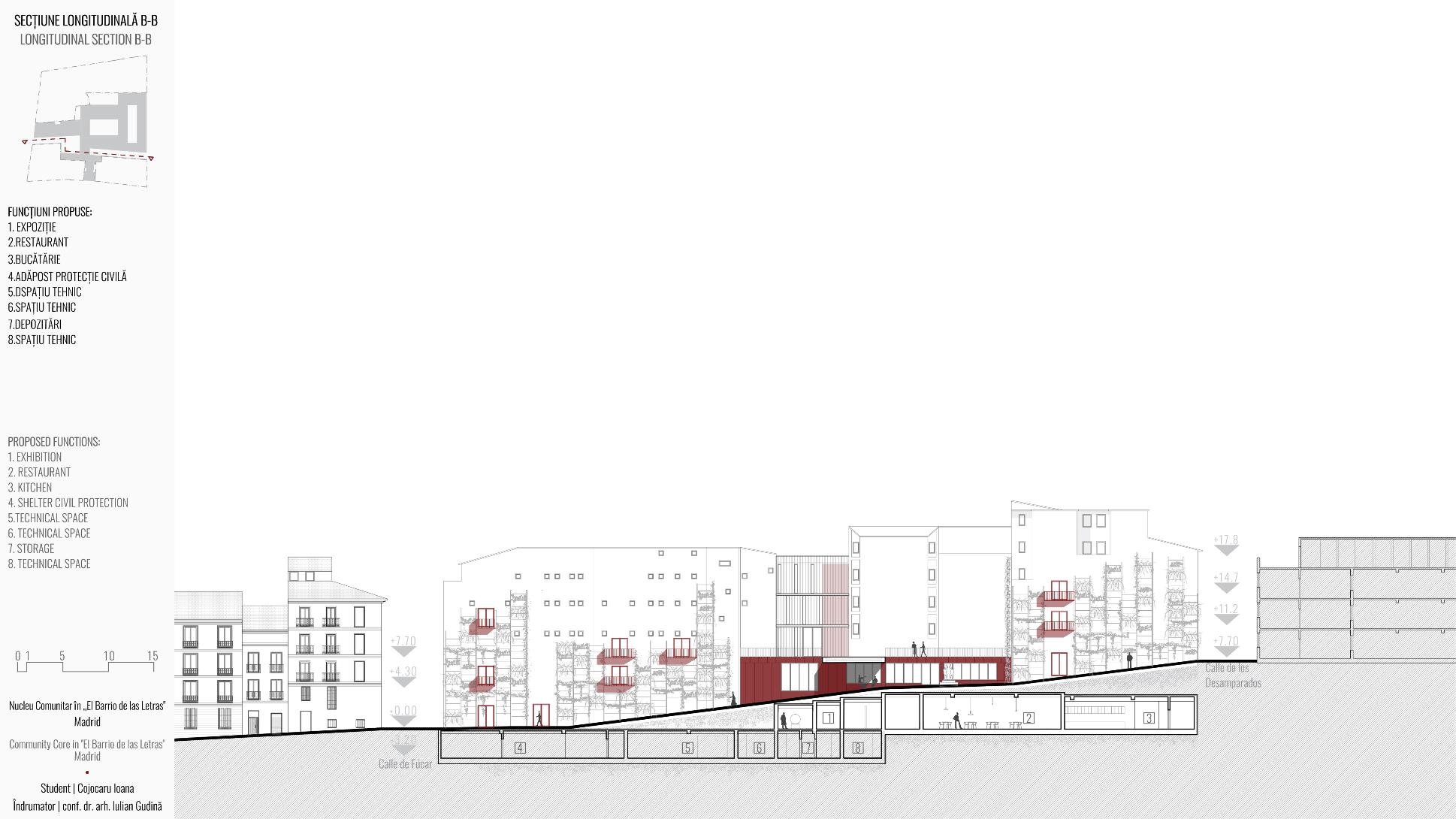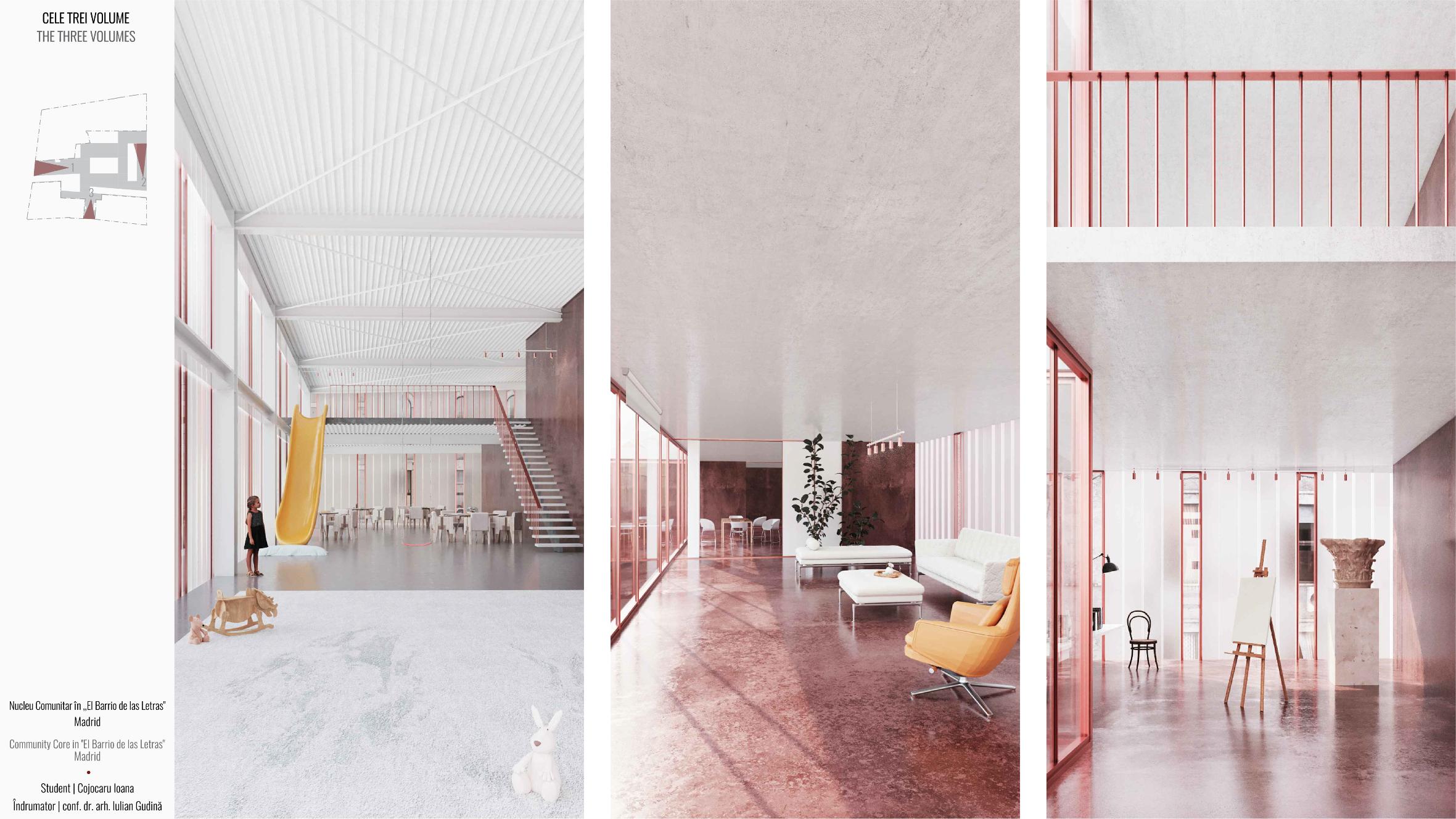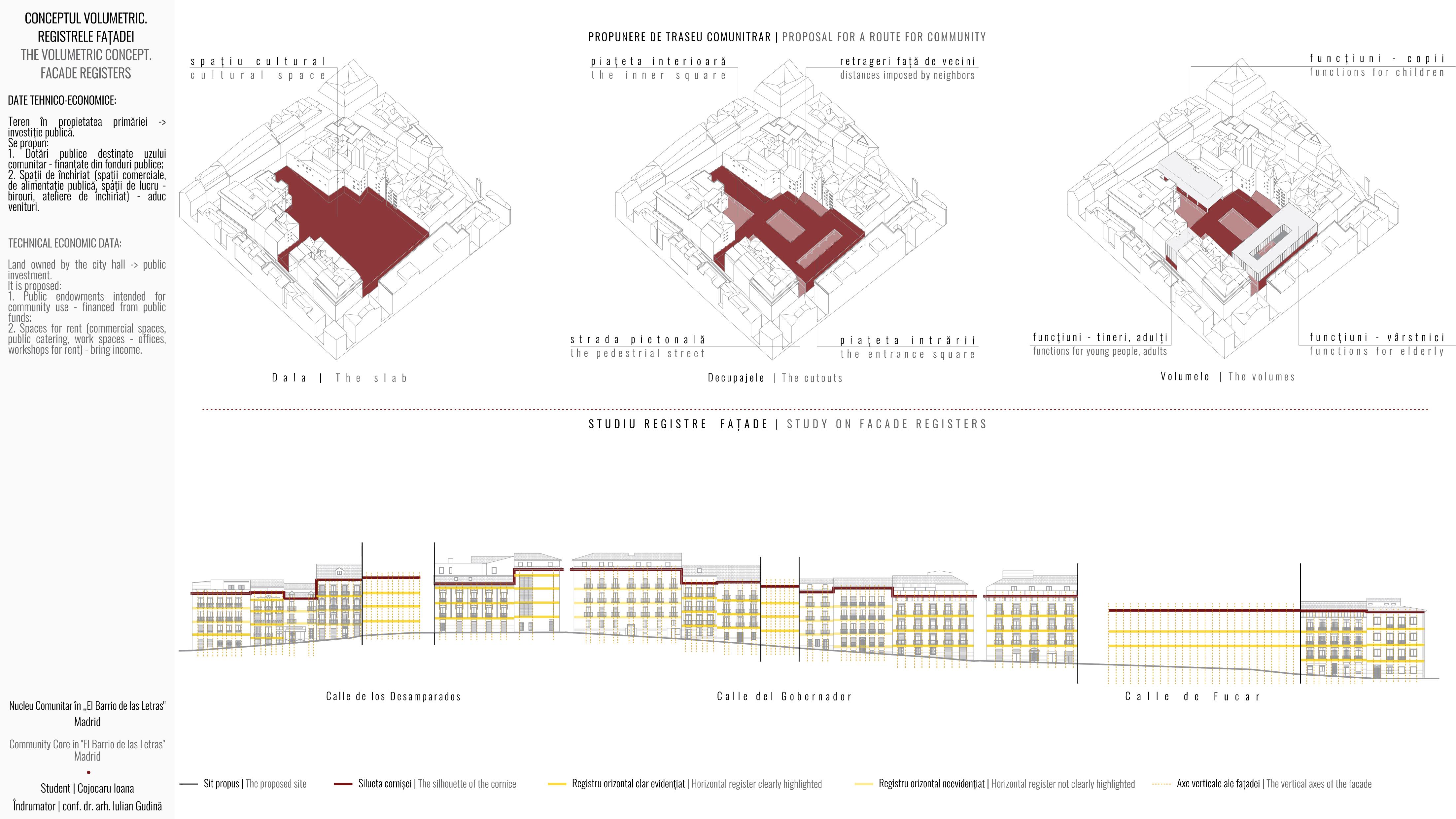 Being on a sloping land opening to three streets, the proposal is în the form of a slab, a massive base that starts from the upper part of the lot. This built mass is sculpted with different urban public spaces (squares, pedestrian street, garden), each of them representing a response to the existing urban context (the creation of a ”protected” garden, retreats from neighboring windows, continuation of Calle de la Veronica, etc.). The character of this base is a massive one (made out of concrete), the materials used creating the impression of weight and tectonics. Over this slab, there can be found three objects, each one being în response to the street to which it opens. They come în the form of ”light” volumes with a steel structure and a predominantly translucent facade. Also, from the analysis of the facades we can see the predilection for continuing the horizontal registers specific to the area, but also the reinterpretation of the area ”above the cornice” of the existing tissue, by creating this dense built mass on which the three objects sit.