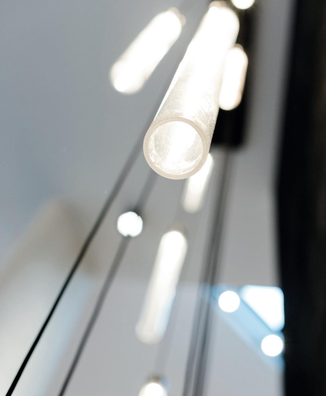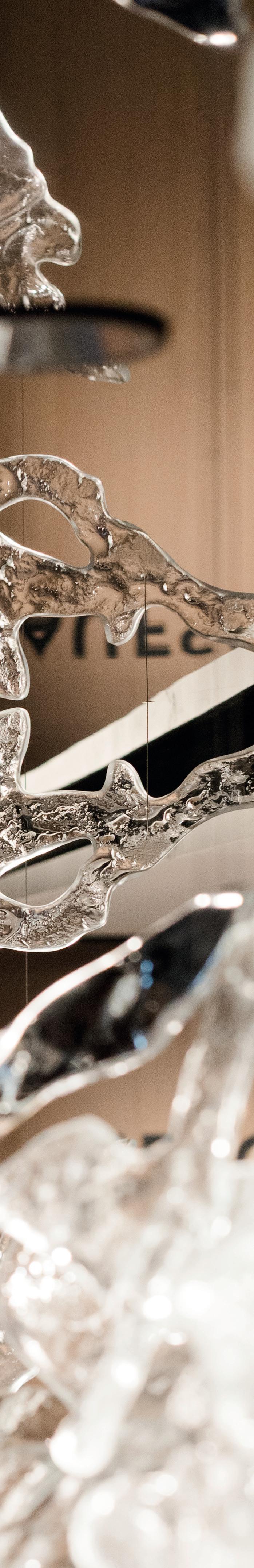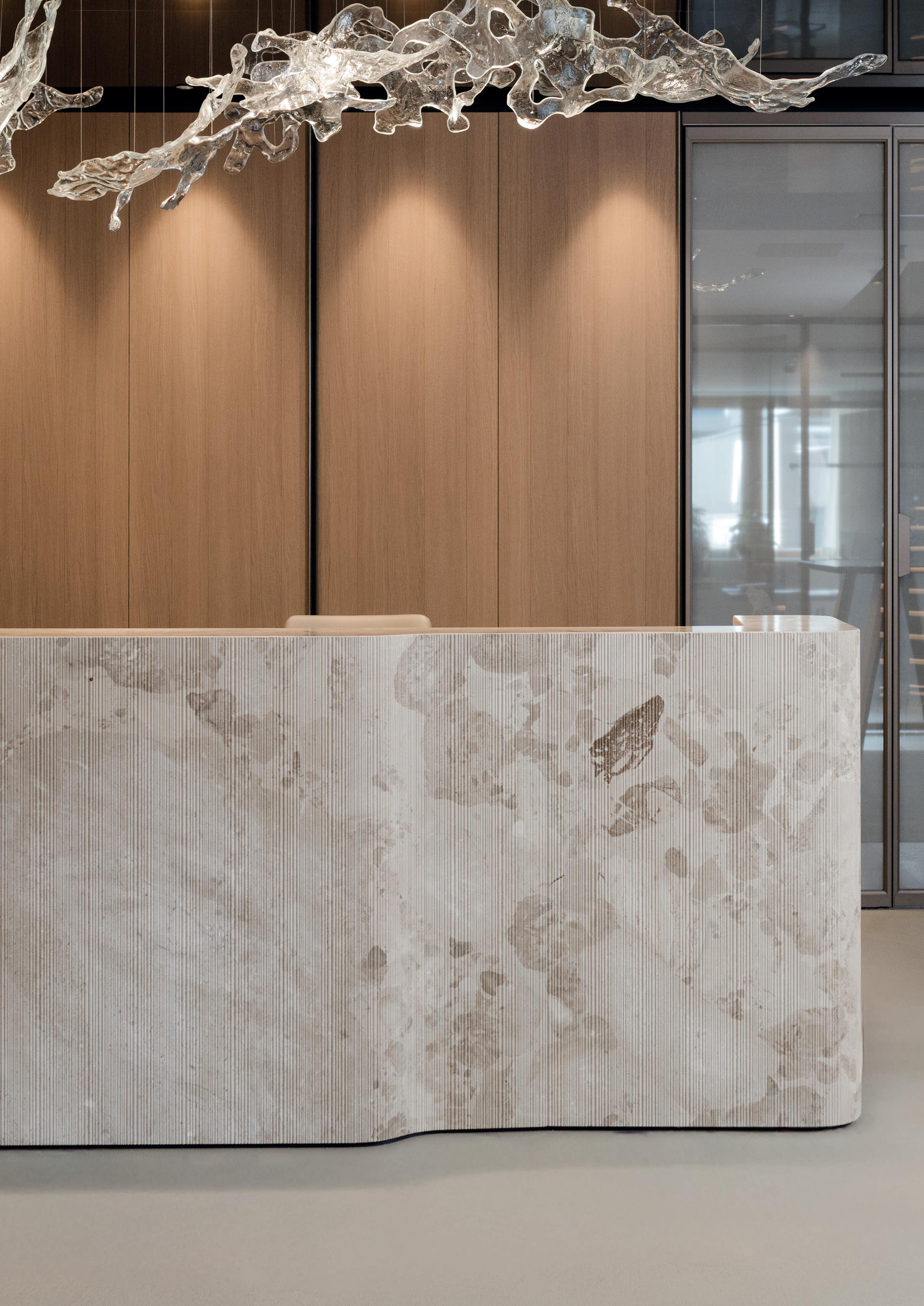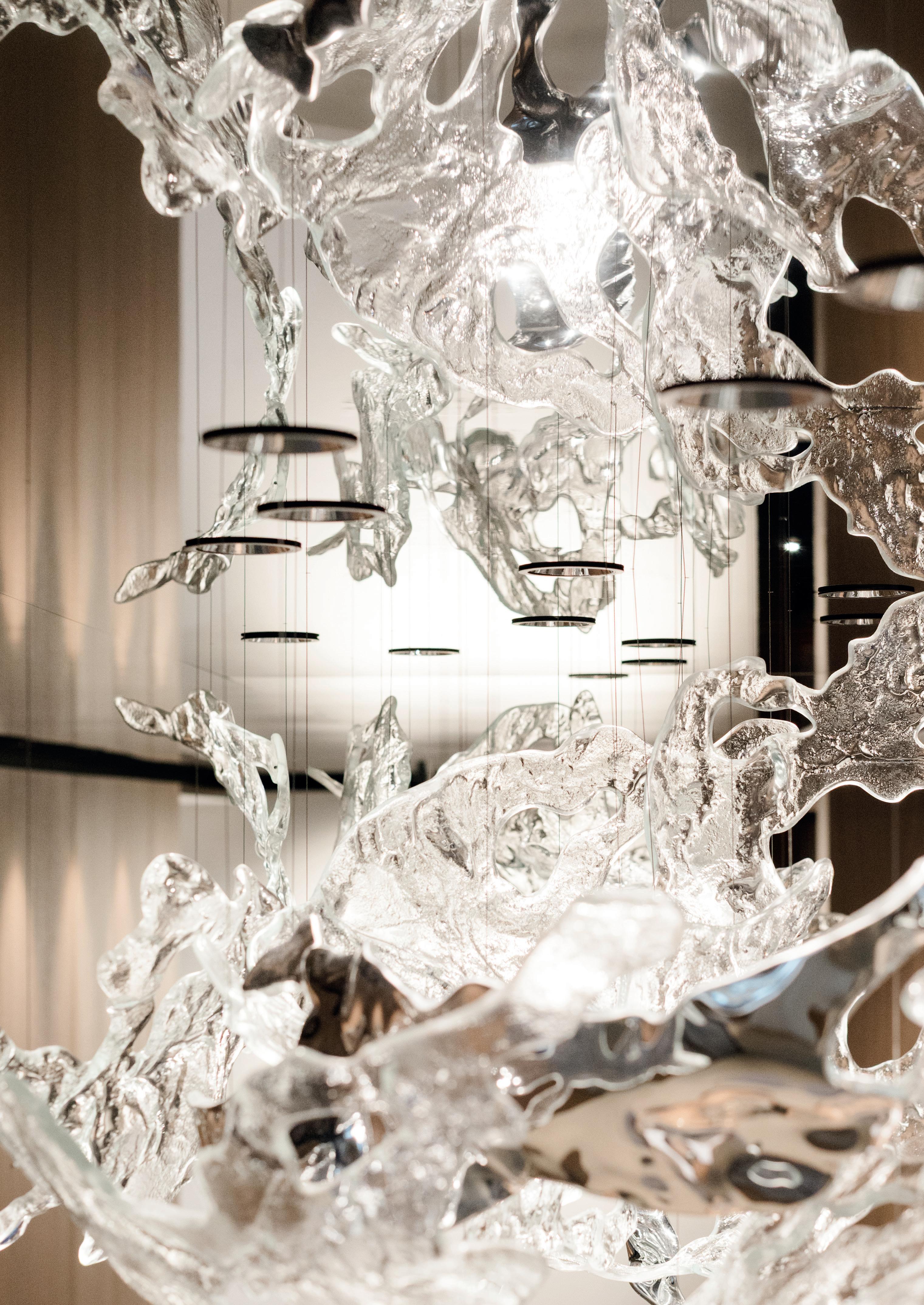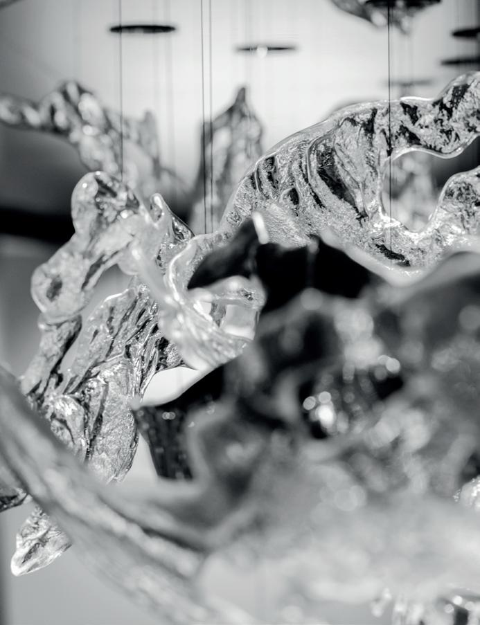 Wasser sucht sich immer einen Weg und passt sich den Gegebenheiten perfekt an. Es nützt – so wie wir –die Chance, etwas Neues zu kreieren. Über dem Welcome Desk im Eingangsbereich entfaltet sich dieses Element als exklusive Glasskulptur von Lasvit. Sie hält sinnbildlich den Moment fest, wenn eine Hand die Wasseroberfläche berührt.