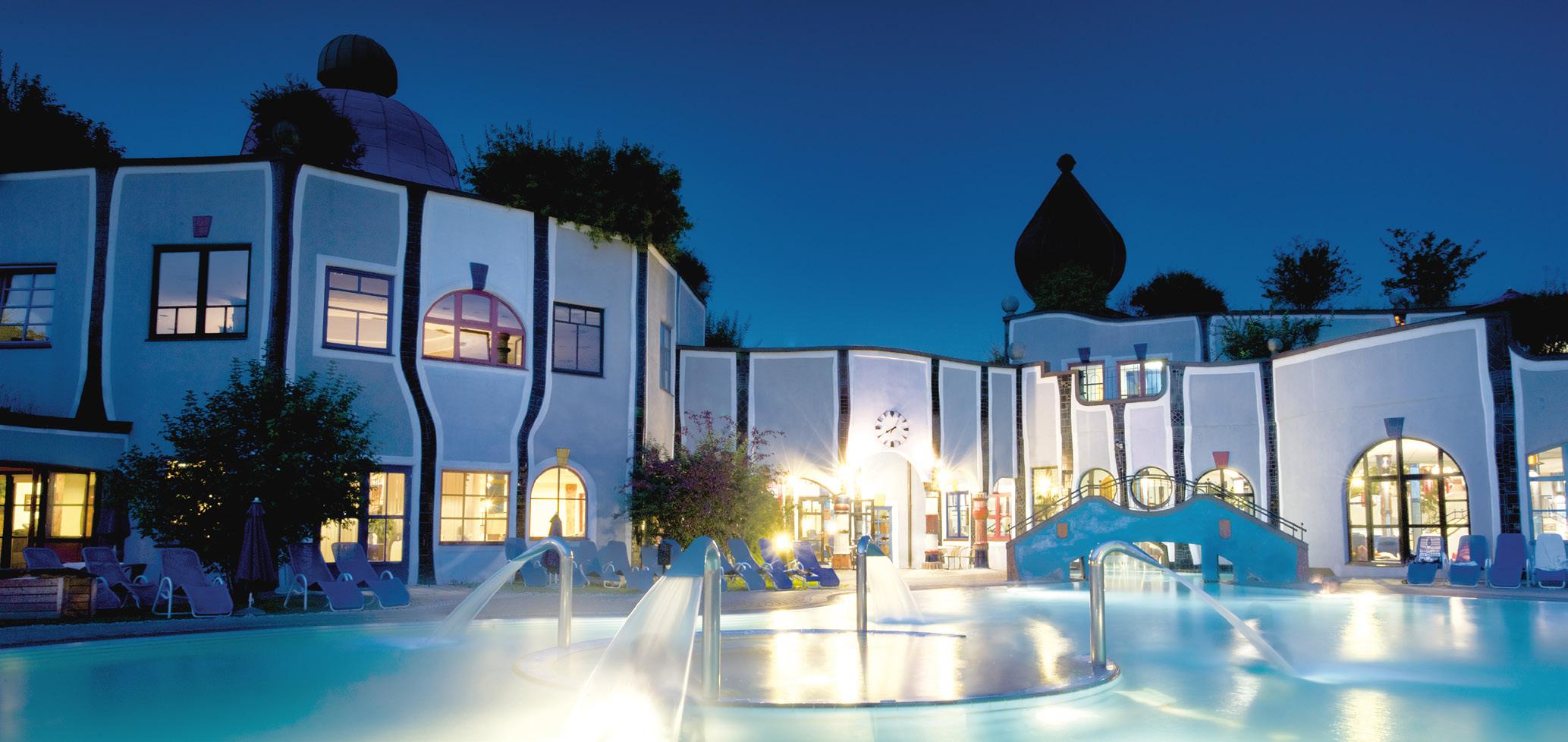 Charakteristisch für die Thermengemeinde Bad Blumau sind die Herzlichkeit der GastgeberInnen, die teilweise unberührte Natur, die Kreativität und Kunst sowie die heilenden Quellen. Eintauchen in die farbenfrohe Welt des Wassers, gestaltet von Friedensreich Hundertwasser. Ein kugelroter Ausbruch an Lebensfreude im Weltunikat Rogner Bad Blumau. Weitläufige Bade-, Thermal- und Saunalandschaft mit Badetemperaturen von 21° bis 37° C. Das Vulkania® Urmeer ist so einzigartig wie die Anlage, in der es zu finden ist. Genießen Sie einen Winterspaziergang zu einer der ältesten Eichen Europas. Malerische Ruhe und Gemütlichkeit bei den familiären Gastgebern und in den erstklassigen Hotels. Erlesenes aus Küche und Keller in den Buschenschenken und Heurigen der Region lässt das Herz von Kulinarik-LiebhaberInnen höherschlagen.