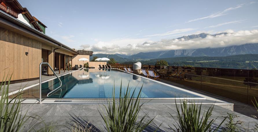 Zufrieden urlauben mit großzügigem Bade- und Wellnessbereich – NEU: Infinity-Außenpool mit traumhaften Ausblicken und Wellnessbereich „Weitblick“ mit Panoramasaunen, verführerischer Kulinarik, stilvoll eingerichteten Zimmern sowie perfekter Lage mit Einstieg in die Schladminger 4-Berge Skischaukel direkt vor der Haustüre