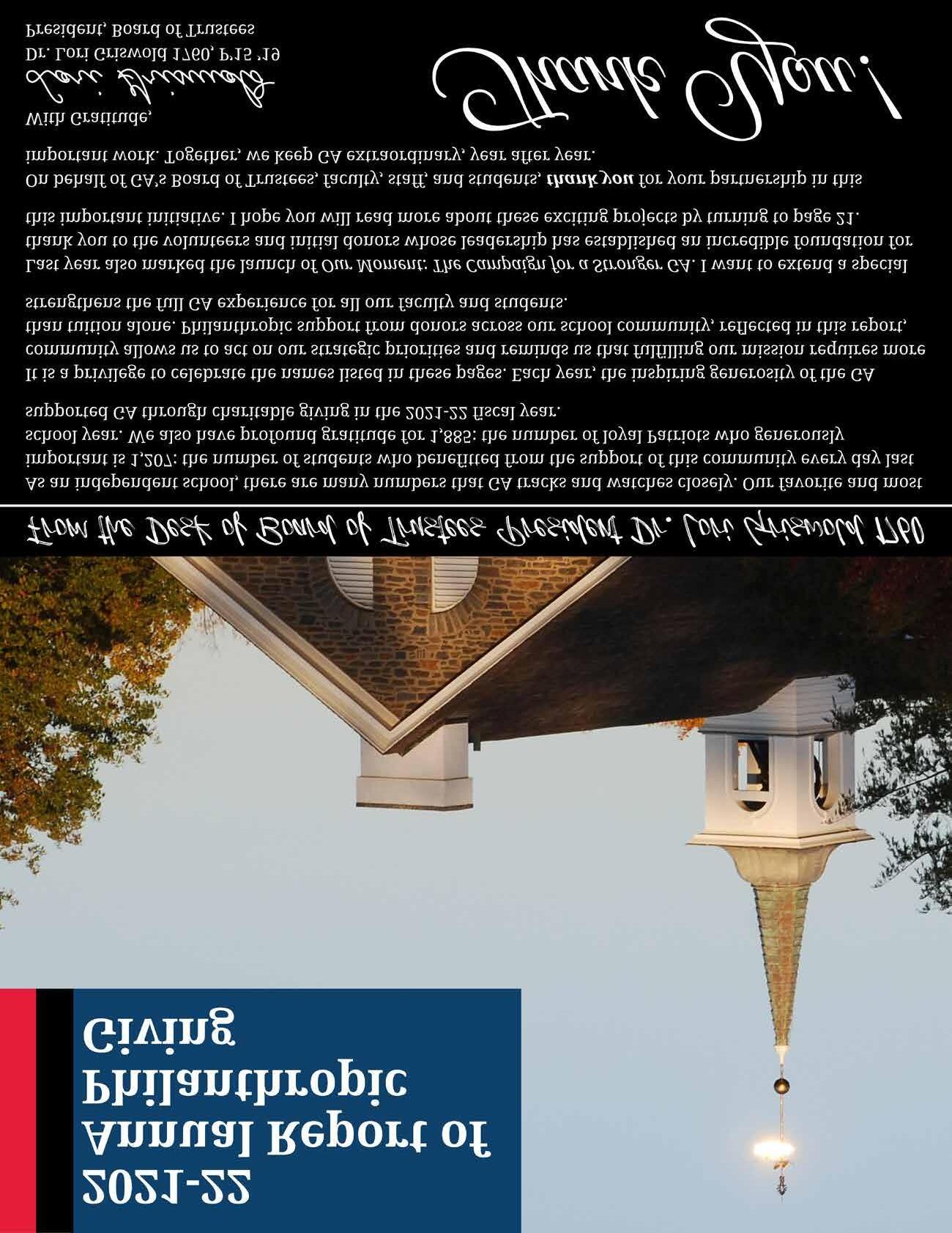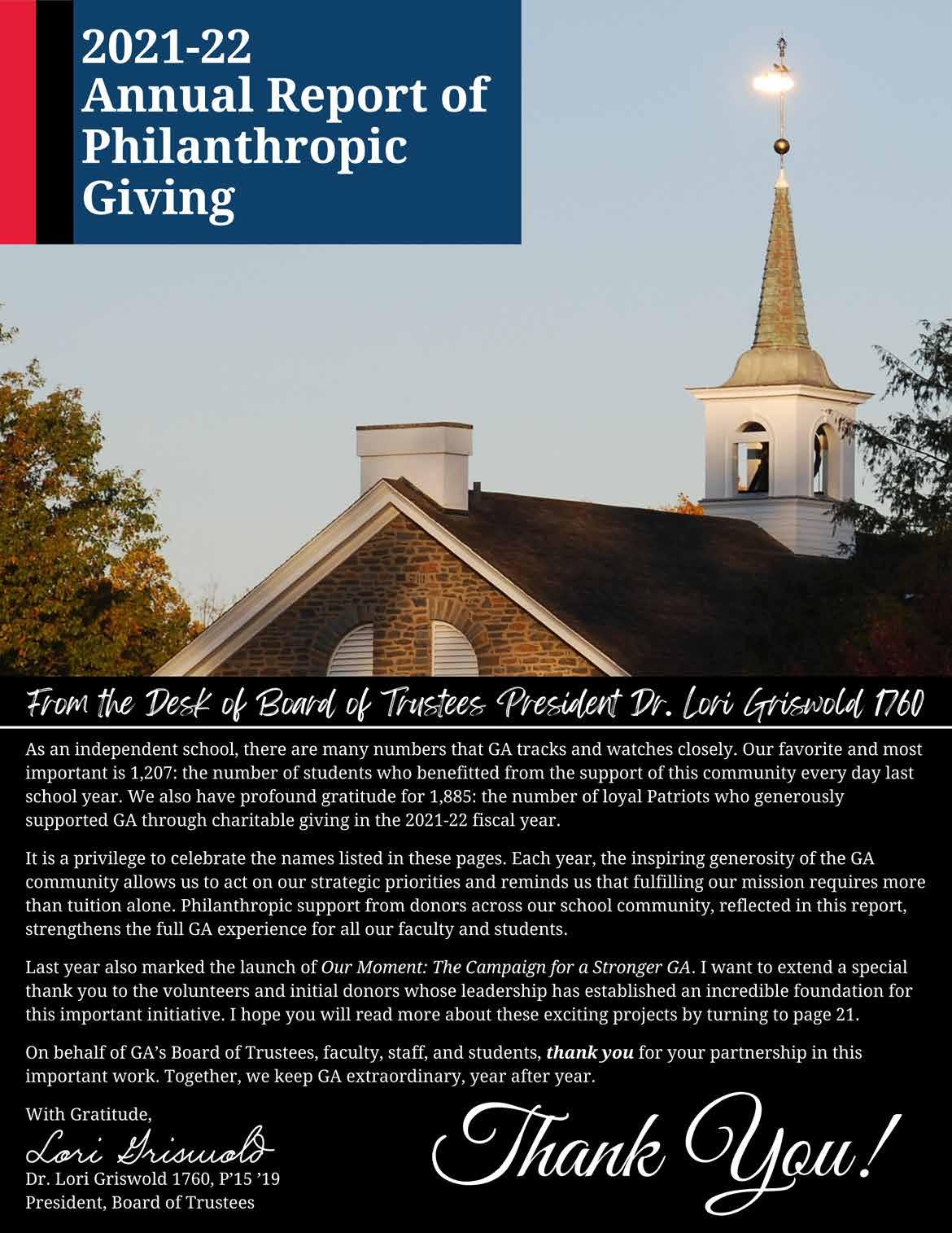 This report presents the names of donors who made gifts to Germantown Academy between July 1, 2021 and June 30, 2022. Donors wh ose gifts were received after June 30 (the fiscal year end) will be included in next year’s Report of Philanthropic Giving.The Office of Institutional Advancement strives to record and report all gifts and donor names accurately, but errors and omissions can occur.We ask that you report any inaccuracies to Meg Peake at 267-405-7503 or meg.peake@germantownacademy.org so that we may correct them for the future.