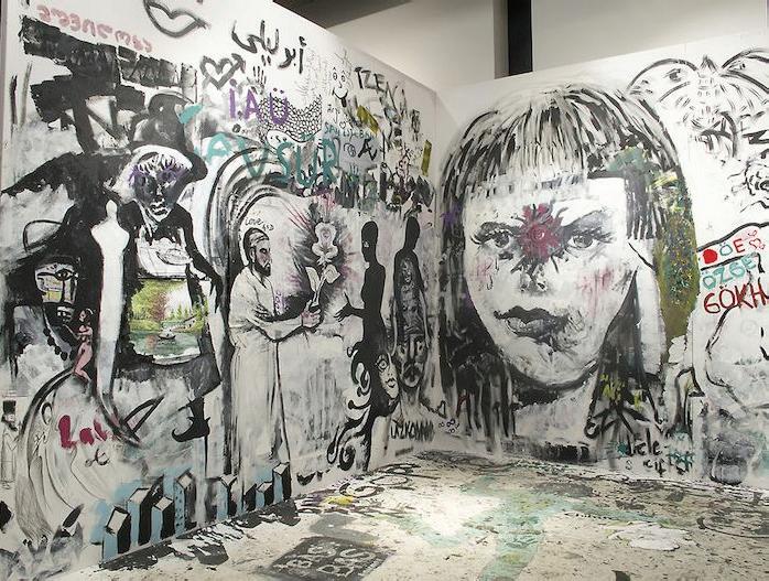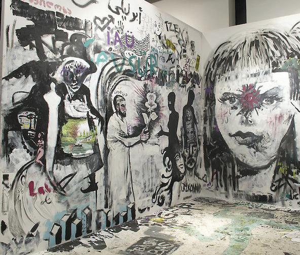 Acrylic Latex Paint from Sherwin Williams in the color White Snow allows visitors to create art on the walls and floors of the designated exhibition spaces. Visitors can rent or buy supplies including washable paints, charcoal, and oil pastels from the recption desk. Thanks to the properties of this paint, the collaborative artworks can be washed off of the surfaces periodically, leaving a blank canvas for the next wave of guests.