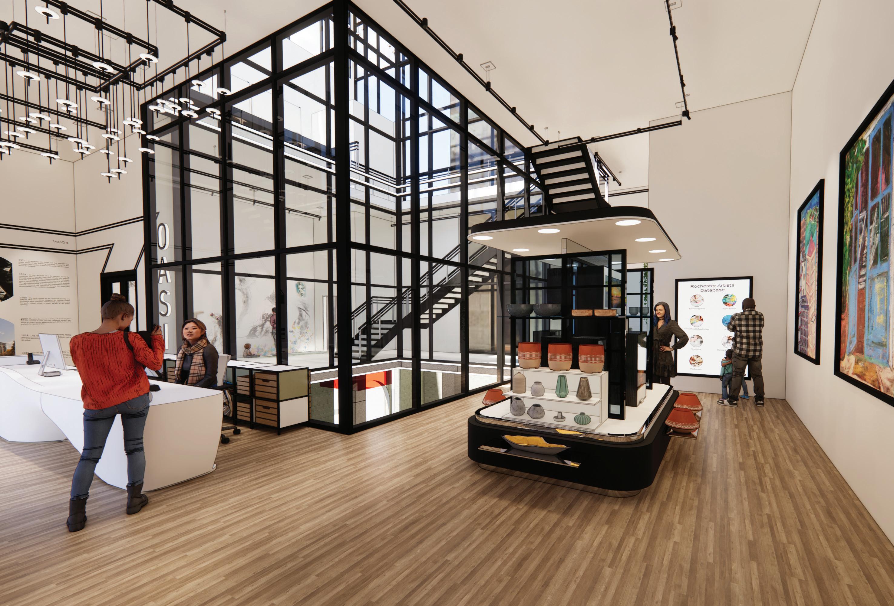 The retail area contains a kiosk selling a variety of works from local artists, a display of rotating larger works on the wall, and an interactive database to connect guests with more artists in the Greater Rochester Area.