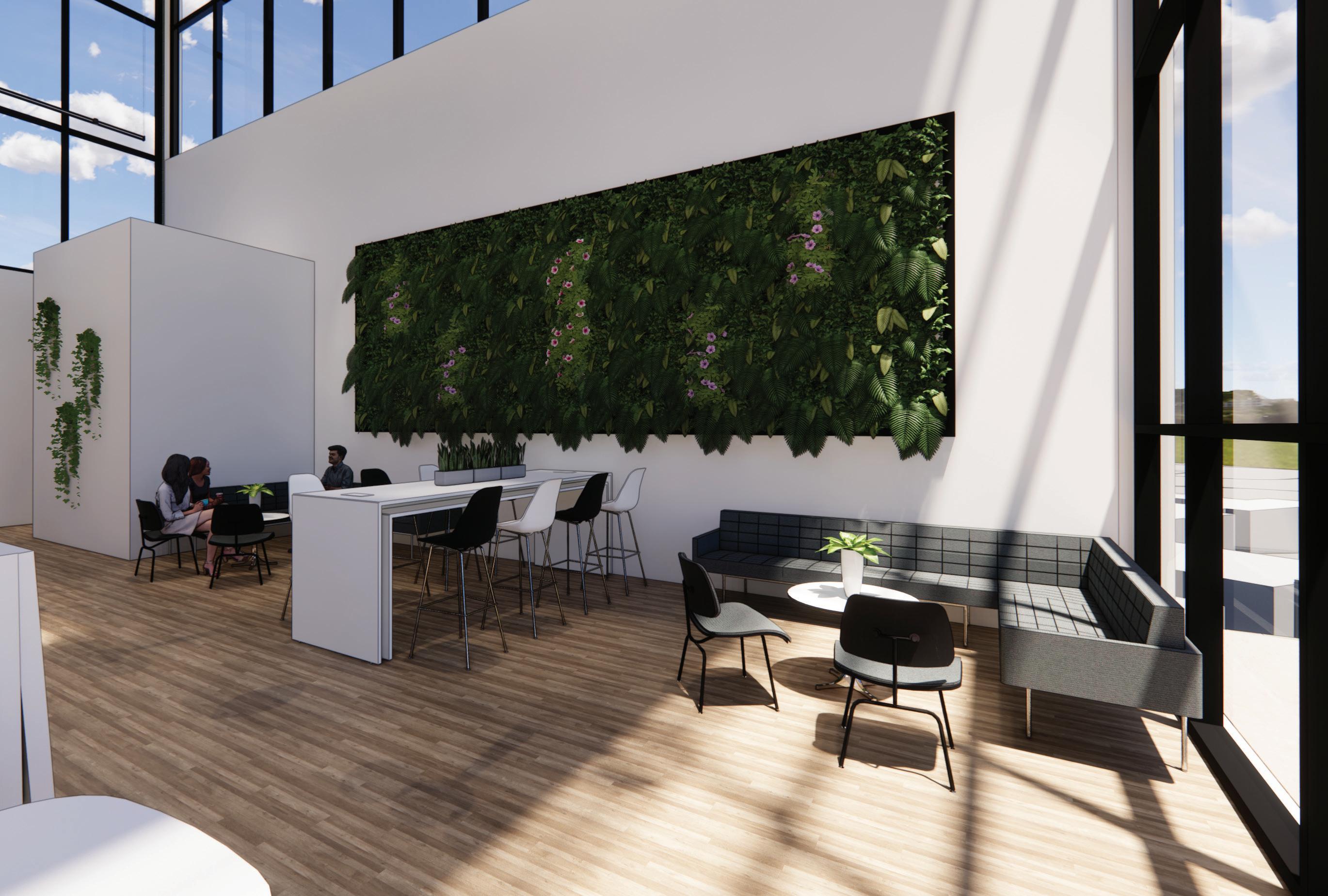 Modular ONE Oak Linea natural wood appearance laminate flooring is used in the entry, retail, and gathering areas.