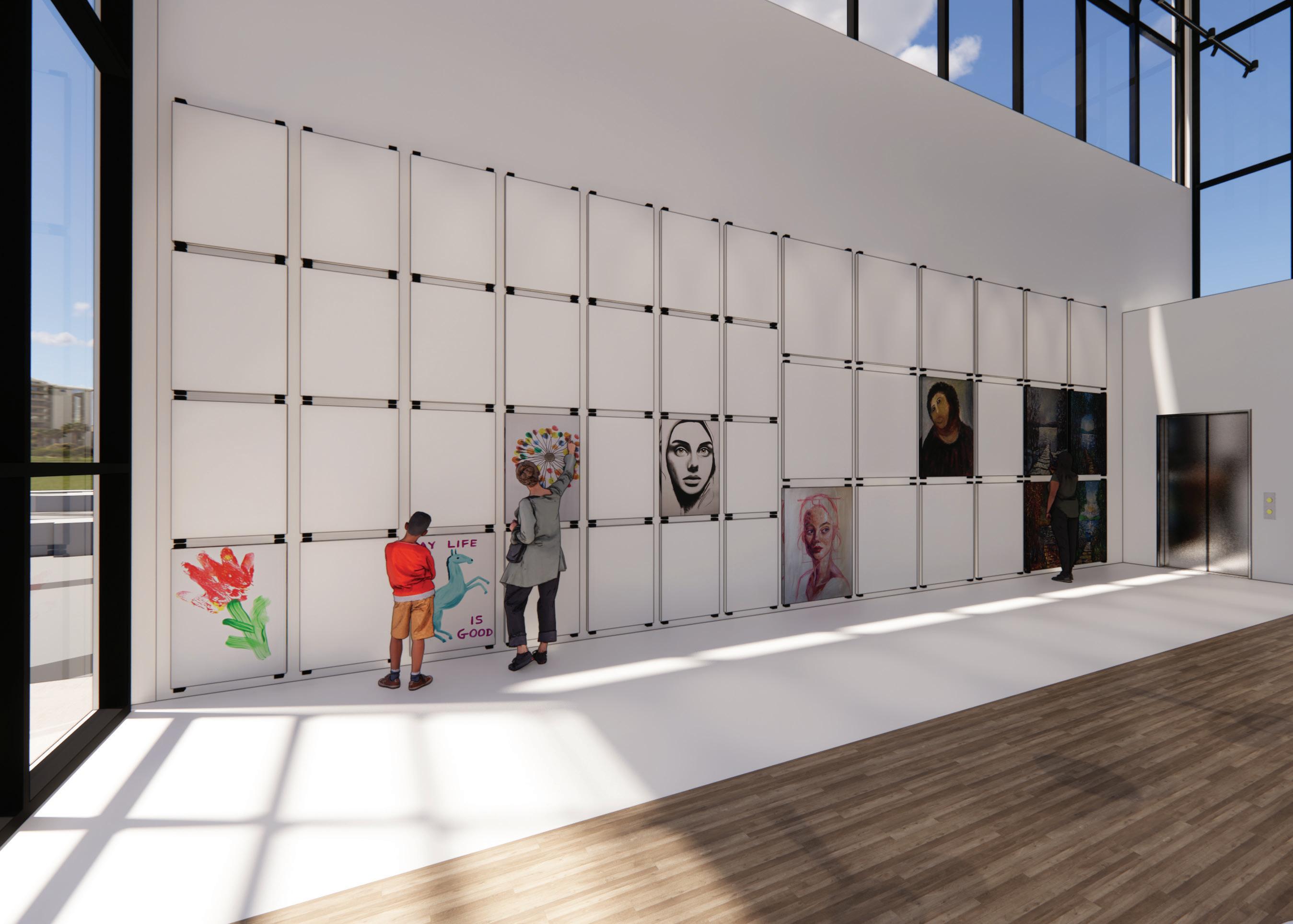 Other changes include the necessary addition of an interior stair and elevator, moving the timeline information to a single wall, and the addition of an interactive database of local artist near the retail area.