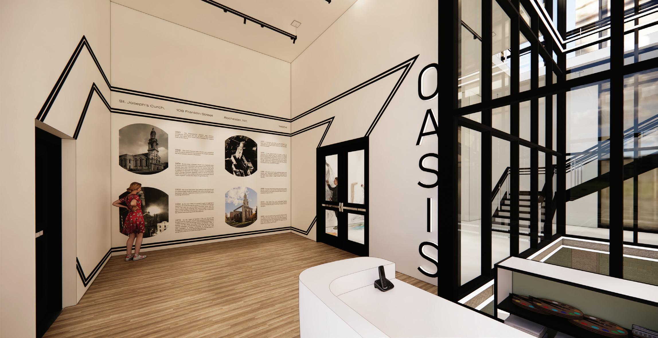It is the mission of this exhibition to bring St. Joseph’s back to its well-respected position in the city by creating an inclusive space where the community can gather and collaborate through art. Accessible to all, anyone in Rochester is welcome to add to the exhibition. Supplies may be rented at the front desk and guests can unleash their creativity on the collaborative wall which is cleaned off once per week, or for guests who wish to take their work home they may do so on the canvas grid wall where they can pay for as many grid spaces as the wall can hold. On the way to the exhibition room, guests can learn about the history of the church’s role in the community, hang out in the open gathering space, or peruse the pieces of art for sale at the retail kiosk.