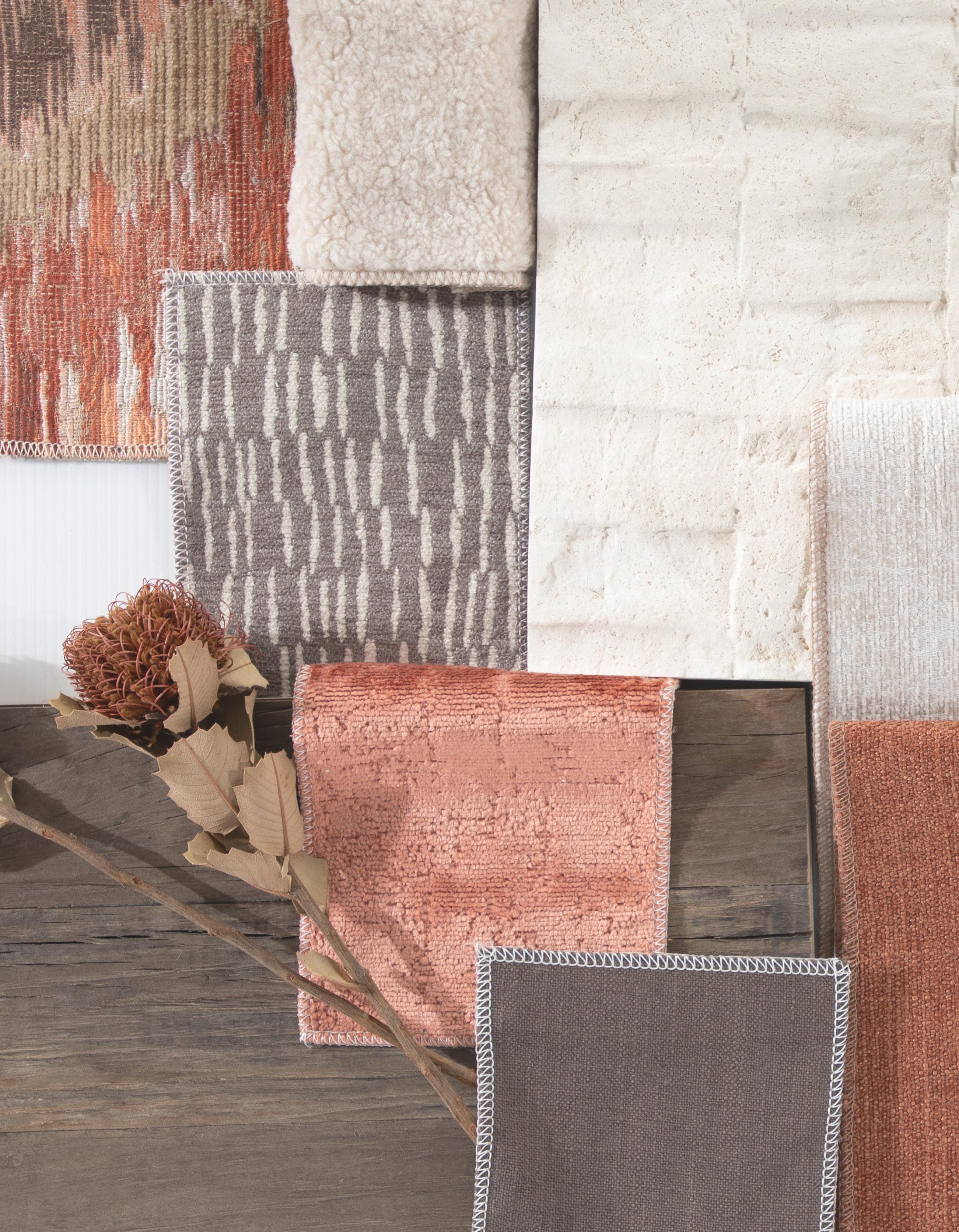 This curated selection of fabrics reflects a seamless blend of comfort and elegance through a warm, neutral color palette. The dominant hues of chestnut, camel, and warm wheat bring a sense of timelessness, while the textured materials – from nubby woven textiles to luxurious velvets – create tactile interest. The subtle play of patterns, like organic stripes and classic geometrics, adds structure and sophistication without overwhelming the senses. These tones and textures are ideal for those looking to infuse their interiors with a grounded, earthy aura that feels both chic and approachable.