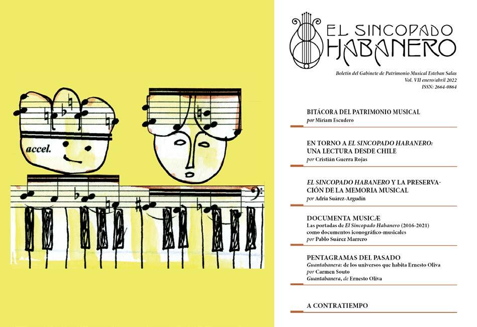 Pablo Suárez, desde un enfoque iconológico, exa mina las portadas del Boletín, buscando la relación entre el lenguaje visual y sonoro, entre la metáfora de la imagen y la sugestión de la música, a partir de la singular relación que se establece entre el artista invitado a cada número y las composiciones que se publican en «Pentagramas del Pasado». Testimonio fehaciente de este proceso quedó capturado en la imagen de contraportada, en la que el compositor Ernesto Oliva, ha regalado a este boletín y a sus lectores su obra Guantabanera (2022), toca al pia no frente al artista de la plástica Nelson Villalobos, para que las musas conecten sus lenguajes.