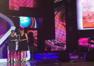 Momento de la entrega del lauro en la categoría Música de cámara de los premios Cubadisco 2017, a la musicóloga Miriam Escudero (a la derecha) de manos de la directora de orquesta Zenaida Romeu.