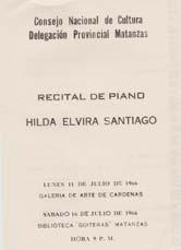 Hilda Elvira Santiago Novo (Matanzas, 1947), prestigiosa intérprete de la escena cubana, quien ha sido punto de referencia y consulta para disímiles músicos. A lo largo de su vida ha desarrollado una relevante carrera pianís tica no solo como solista, sino también en la Orquesta Sinfónica de Matanzas por más de tres décadas. Resalta su labor pedagógica e intelectual, ejercida fundamentalmente en Matanzas y La Habana. Trascendental en su carrera ha sido la composición musical para obras de teatro.