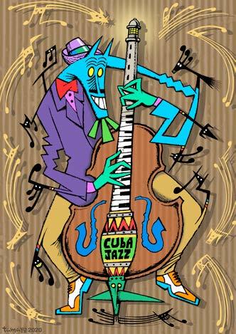Así que para estimular la belleza fue encargada una portada icónica del jazz al artista visual Reynerio Tamayo. Él, con maestría surrealista, ideó un híbrido integrado por algunos de sus instrumentos más repre sentativos. Con cuerpo de contrabajo, el faro del Castillo del Morro de La Habana hace las veces de clavijero, el brazo está hecho a manera de teclado, las efes tienen forma de saxofón alto y una pintoresca tumba dora remata el cordal. Un personaje colorido, que parece salido de un cuadro de Wifredo Lam, lo hace sonar al estilo del “Afro-Cuban Jazz”.