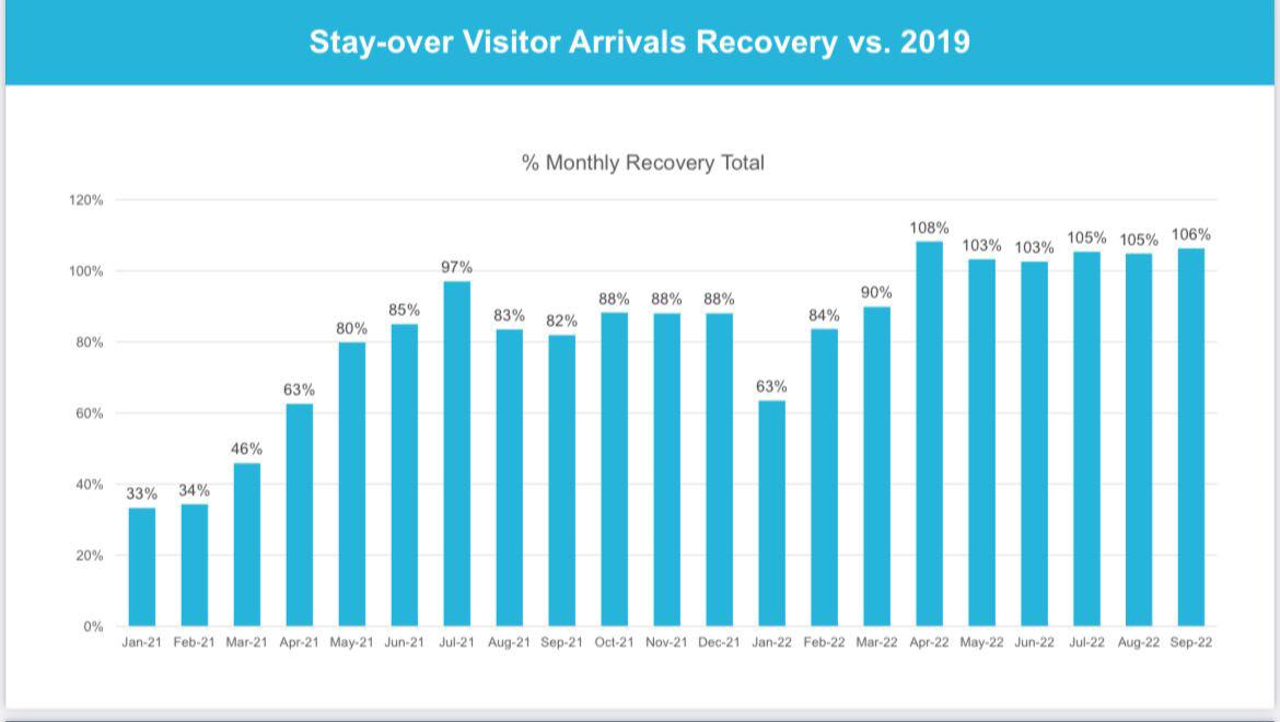 Desde reapertura Aruba a experencia un recuperacion exitoso. Entre april y augustus 2022 yegada di bishitantenan a surpasa e cantidad di bishitante pa luna cu a ricibi na 2019, algo cu ta duna siguransa cu lo tin un recuperacion di 100% di bishitante global pa fin di e aña aki. Pa 2023 ta proyecta un recuperacion di 105% compara cu 2019.