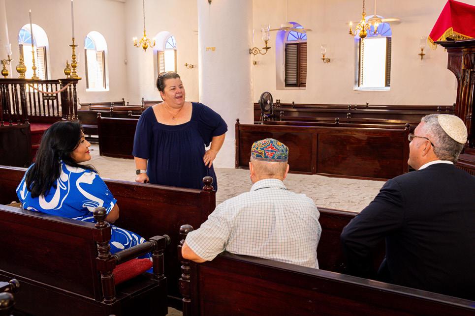 Minister Maduro a wordo ricibi y guia cariñosamente pa sra. Michèle Russel-Capriles hunto cu otro miembro di e directiva sr. Sinuhe Oomen y Rabbi Martin Hirsh, kendenan a duna e mandatario un splicacion den e tempel. E SNOA na Corsou a wordo consegra na aña 1732 y ta e sinagogo mas bieu den uzo continuo na e continente Americano. E monumento historico aki ta forma parti esencial di e historia di e Hudiunan cu a scapa fo'i Spaña y Portugal den e añanan 1500 y cu via Hulanda a bin establece nan mes na Corsou y den e region. E edificio ta den arkitectura Hulandes y ta conta cu meubles di mahony, bunita candelaria y adorno di koper y plata, y un piso