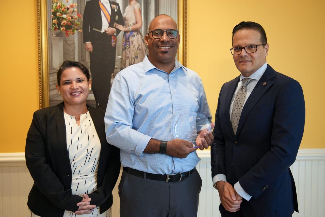 E mandatario a presenta Richi cu su Decreto Gubernamental, carta di felicitacion y hunto un recuerdo y un regalito chikto pa recorda e aniversario importante aki. Di parti di su coleganan, sr Werleman a presenta Richi cu un plakaat como aprecio pa su 25 aniversario di trabou.