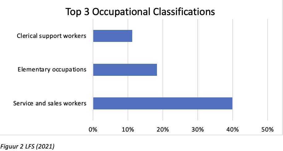 Nos sector di hotel y restaurants (accommodation and food services), cu ta e sector mas grandi di empleo na Aruba, ta duna rond 10% di nos hobennan empleo. Den e siguienta illustracion por mira cu un parti grandi (20%) di e hobennan di 15 – 24 aña ta elabora den e grupo di funcion: ‘service and sales workers’.
