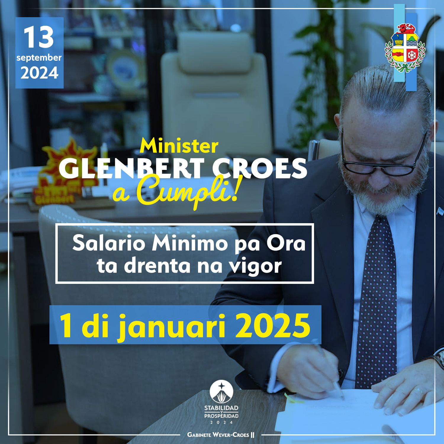 Minister di Labor Sr. Glenbert Croes ta anuncia cu hopi orguyo cu despues di dos aña di trayectoria, Conseho di Minister di Gobierno di Aruba a aproba salario mínimo pa ora. Un aumento cu lo beneficia significativamente tur trahado aki na Aruba. E cambio aki ta resultado di hopi analisis y investigacion cu a inicia na 2022 y ta drenta na vigor 1 di januari 2025. Salario minimo pa ora ta representa progreso importante pa un salario mas husto.