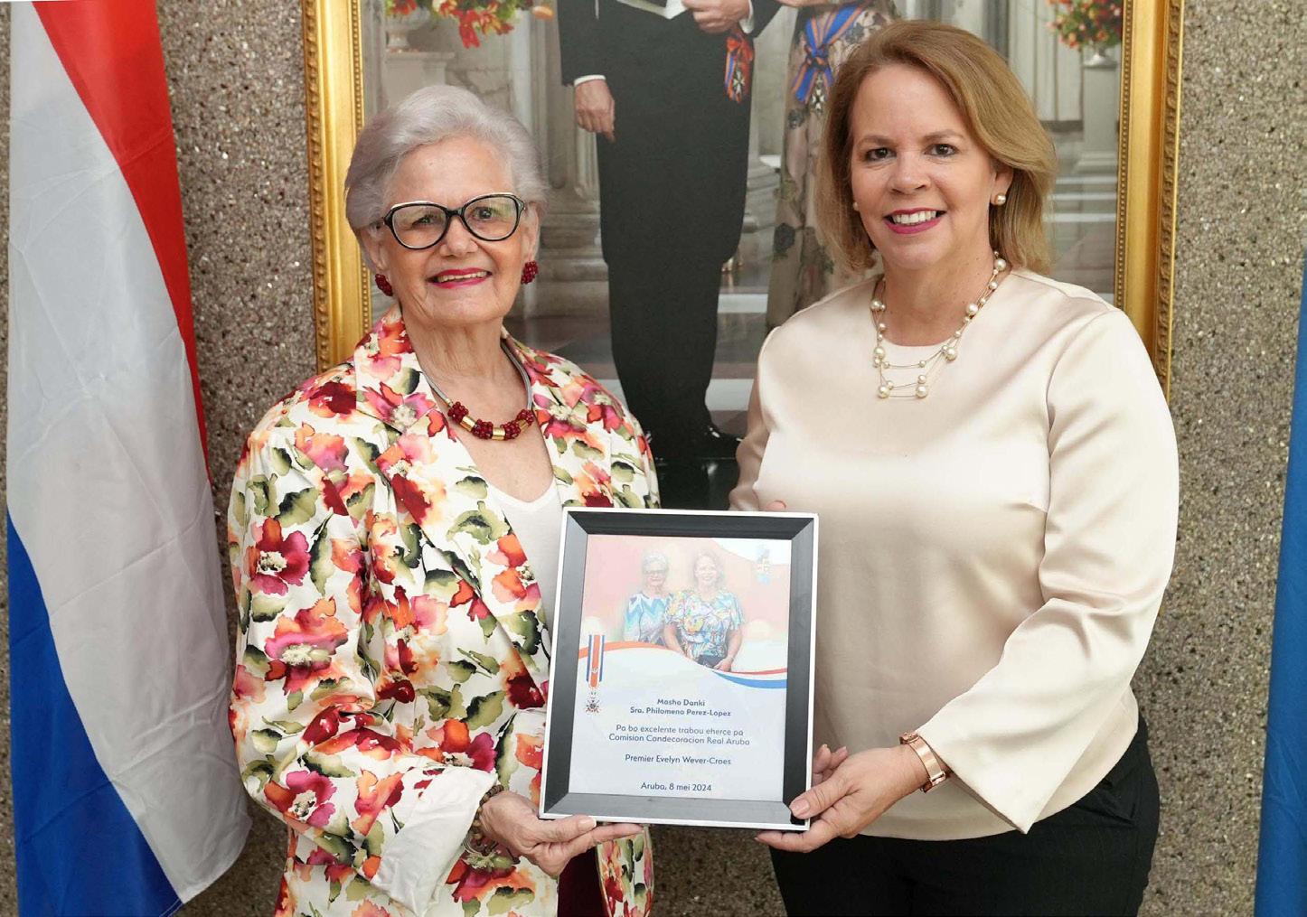 Siman pasa durante un encuentro masha ameno, Prome Minister Evelyn Wever-Croes a tuma despedida di e Presidente di e Comision Condecoracion Real na Aruba, seƱora Filomena Lopez.