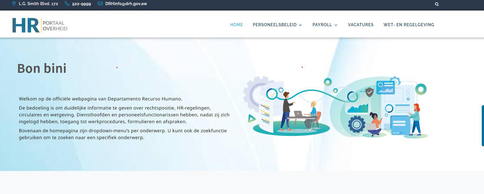 Departamento Recurso Humano (DRH) ta lansa entrante 14 december 2022 e website “HR-portaal” cu ta contene informacion di e maneho di recurso humano di Pais Aruba. E intencion ta pa tur empleado publico tin acceso directo na informacion cu ta regarda nan posicion huridico trahando pa Pais Aruba.