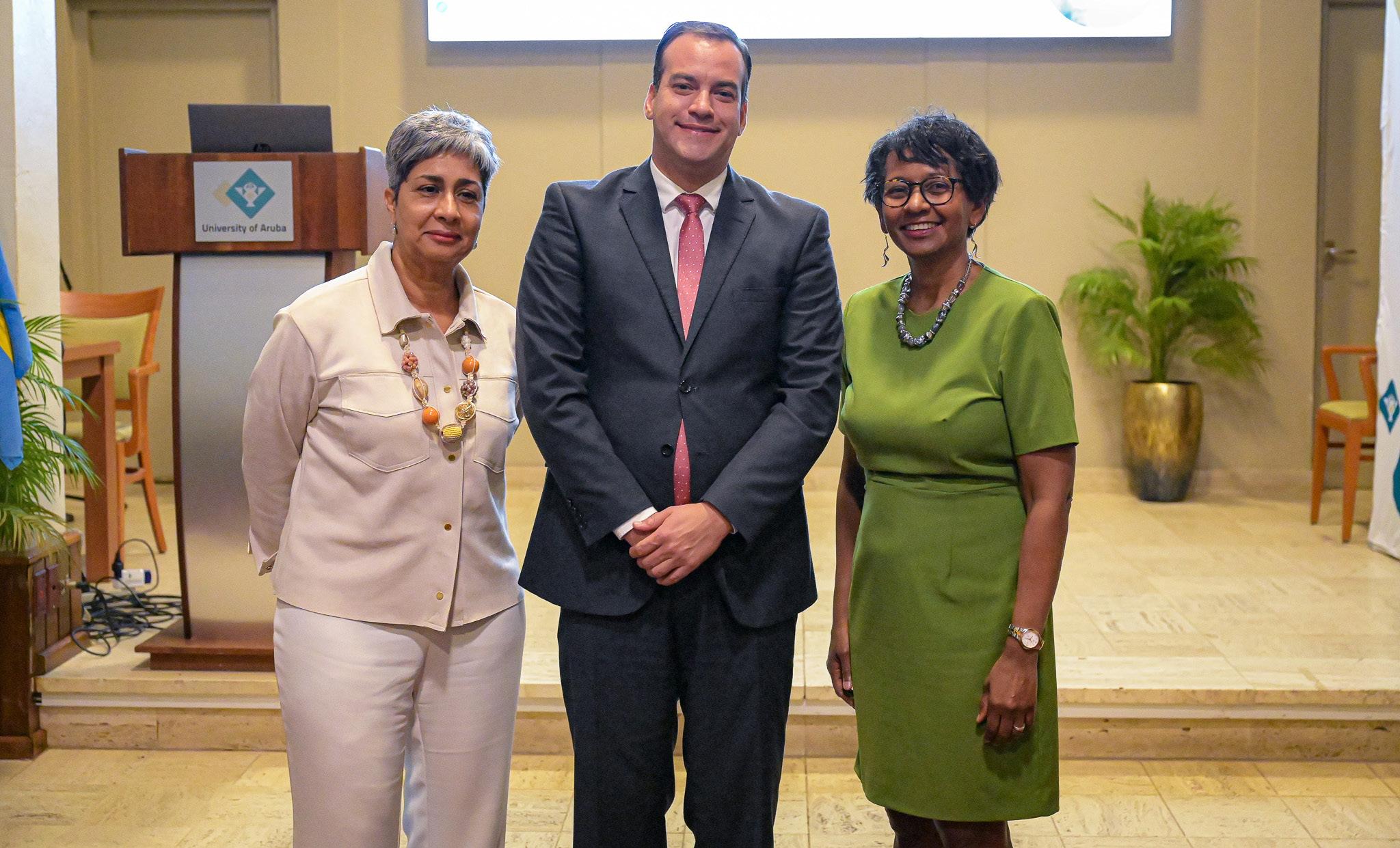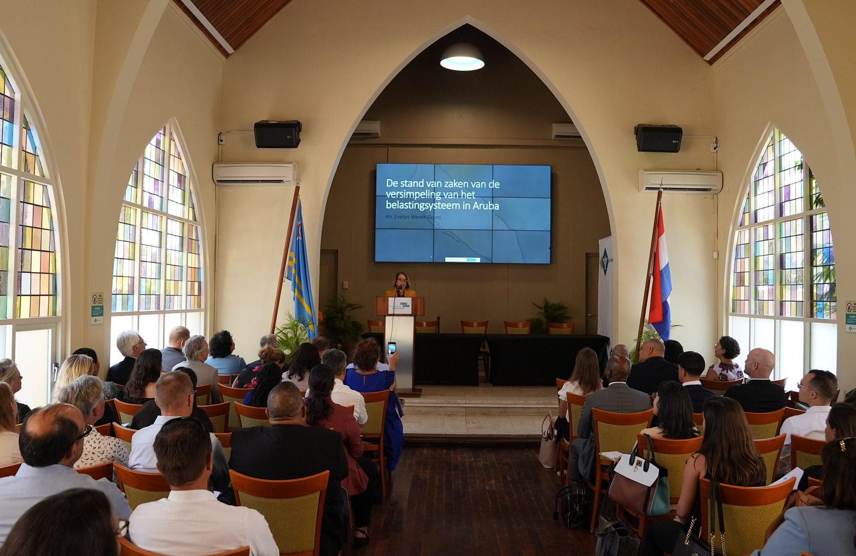 Prome Minister Evelyn Wever - Croes tabata orador invita pa Corte di Husticia, na un simposio titula: “E Futuro di Fiscalidad den e Parti Caribense di Reino”. E simposio ta dedica na despedida di Hues Mari de Werd cu tabata Aruba su prome hues di belasting.