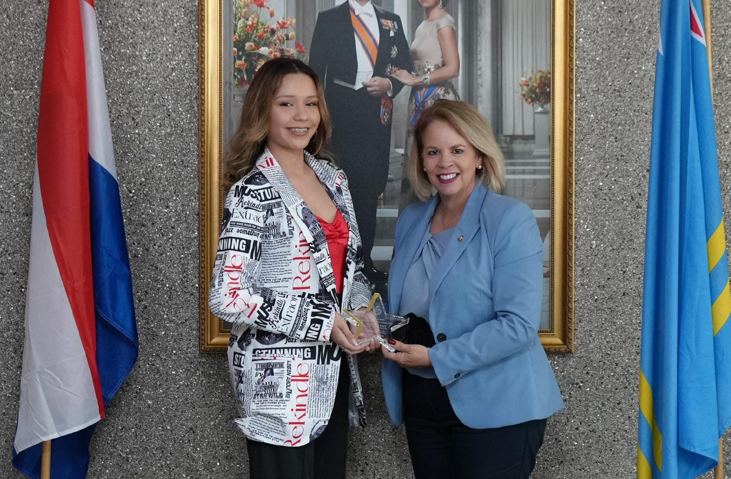 sra. Chastity Kock-Hodge cu un reconocemento di Excelencia pa su 25 aña di dedicacion, profesionalismo y dinamismo den e mundo di modelahe, canto y baile riba tereno nacional y internacional. Tambe Prome Minister a gradicie pa e trabou bunita cu e ta bin ta eherciendo, specialmente pa yuda nos muchanan special desaroya nan potencial y logra cosnan grandi riba pasarela internacional.