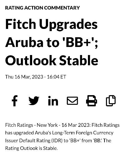 Aruba pa e recuperacion fuerte di Aruba su economia y finansas publico despues di pandemia. Otro puntonan positivo accentua pa Fitch Ratings ta e stabilidad politico y e relacion constitucional cu Hulanda, cu a wordo comproba durante pandemia por medio di sosten di likides y donacion di vacuna.