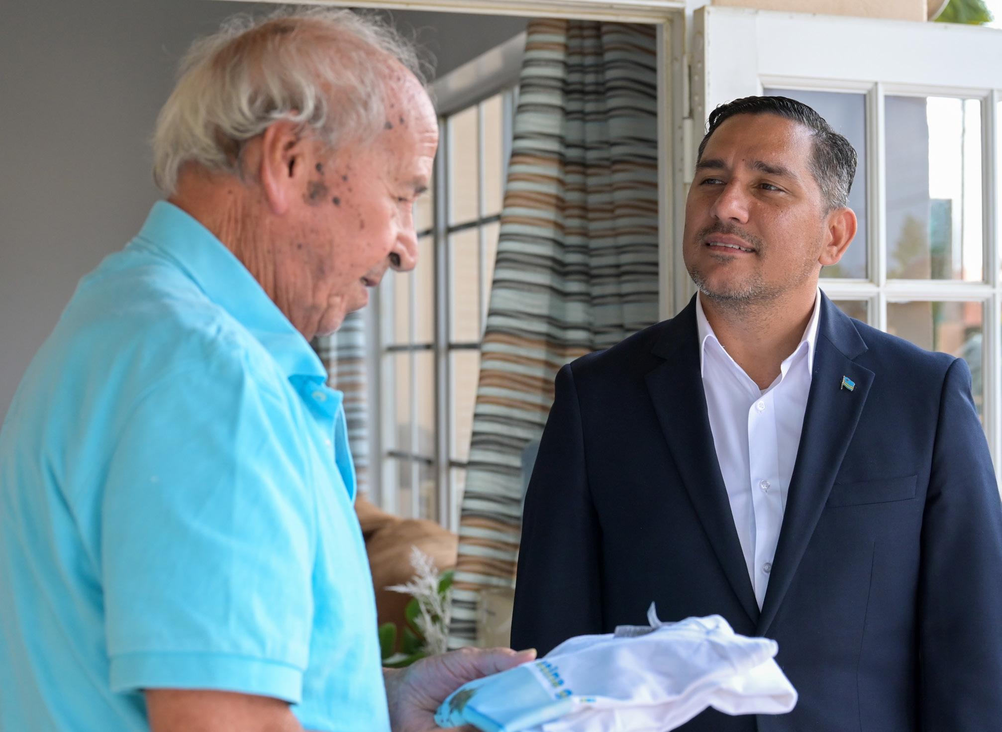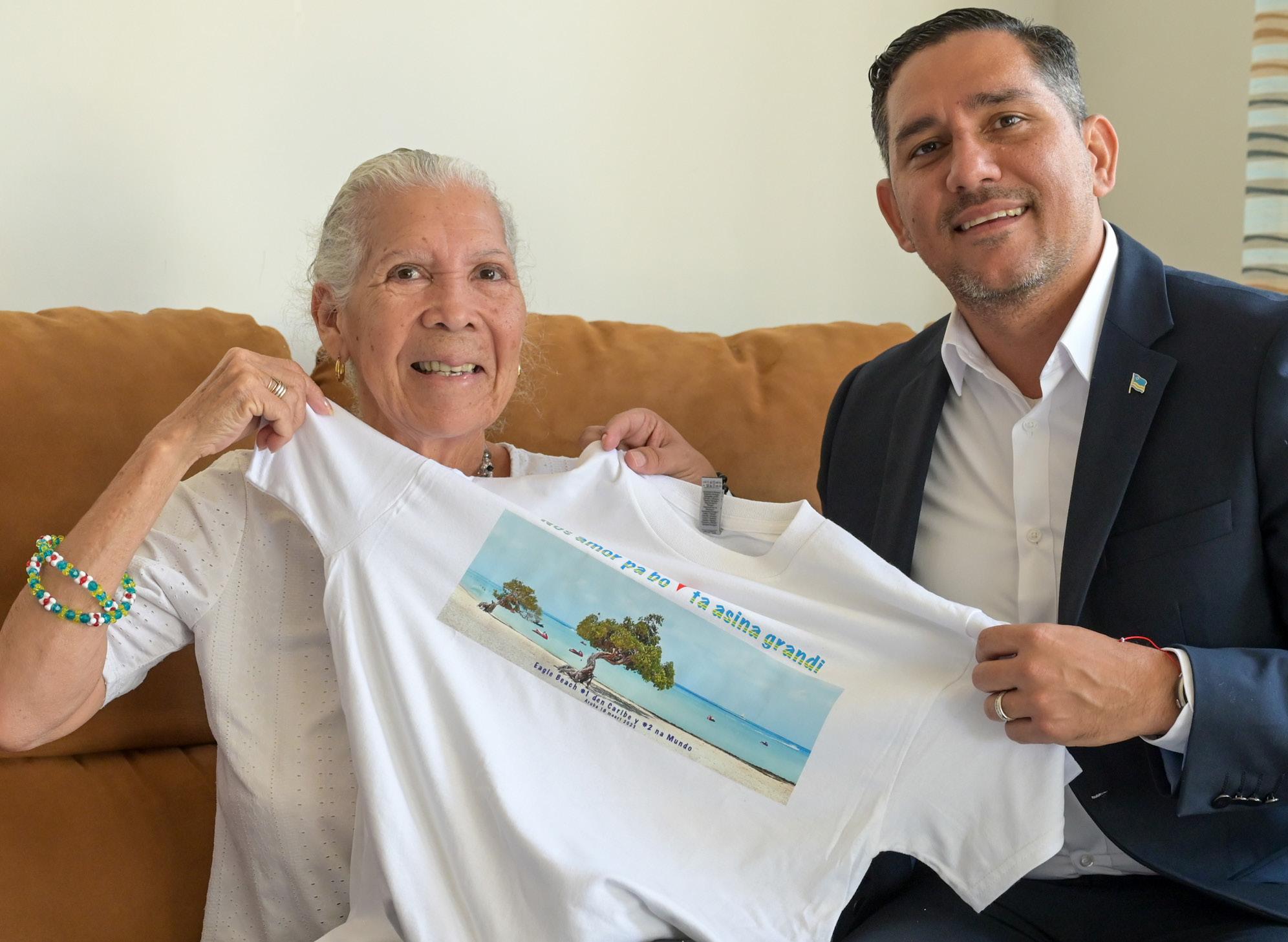 Den cuadro di celebracion di Dia di Himno y Bandera riba 18 maart, Minister di Asuntonan di Adulto Mayor a bishita diferente casnan di cuido pa trece e ambiente di nos baranca tan stima y reparti T-shirt pa celebra nos dushi tera.