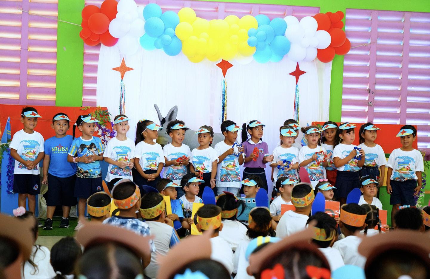 Na yegada e dignatario a wordo ricibi pa cabesante di scol, Sra. Lilian de Kort – Boekhoudt, alumno y docentenan. E mainta a inicia cu canto di nos Himno Aruba Dushi Tera, sigui pa Himno di scol Nos Paraiso canta pa e alumnonan.