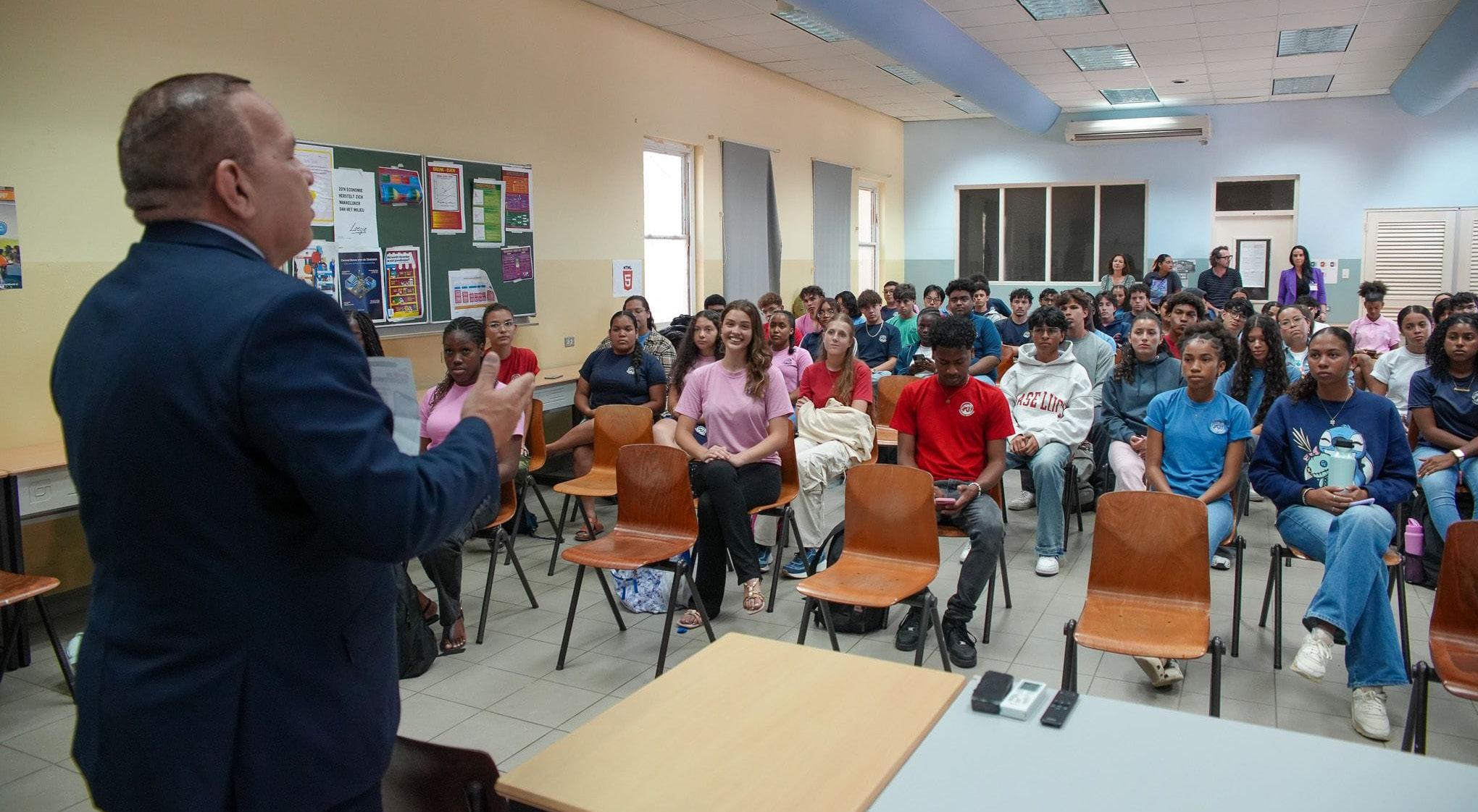 Rector di Colegio Arubano Sr. Tim Croes a gradici Minister Endy Croes pa bishita Colegio Arubano y pa trece informacion valioso pa e alumnonan cu ta biahando pa Hulanda e proximo aña. “Nos ta gradici Sr. Tim Croes, decaan, docente- y alumnonan pa e caluroso recepcion. Nos ta warda e studiantenan mas un (1) mayor dia 26 di september proximo pa 6 ‘or di atardi na IMAX Gloria”, Minister Endy Croes a conclui.