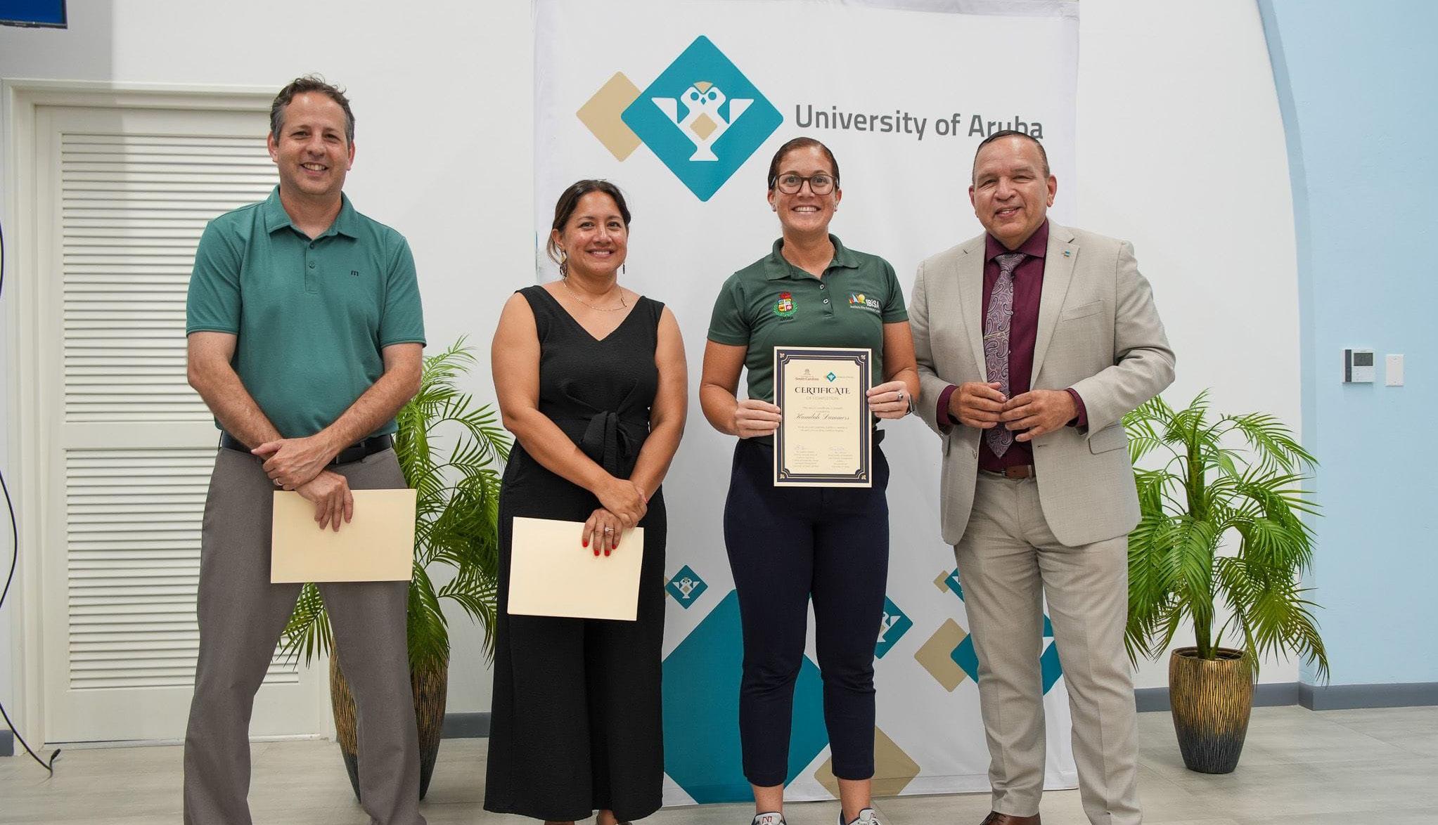 E principio y practica cu a cubri den e sesionnan a ekipa e participantenan cu e hermentnan necesario pa planea, organisa, mercadea, crea fondo y opera evento deportivo na Aruba. Palabra di pabien na tur cu a finalisa e curso aki cu exito. Alabes e mandatario di Enseñansa ta gradici University of South Carolina, Universidad di Aruba, Sra. Sue -Ann Lee y Sra. Jo-Anne Croes cu a trek e bunita proyecto aki. Por ultimo, Minister Endy Croes a inidica cu Sport & Event Management ta continua den aña 2025.