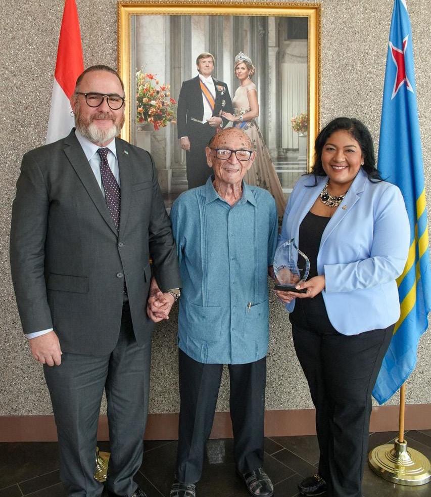 Diaranson atardi Ministernan Maduro y Croes a ricibi e pionero den turismo di Aruba, sr. Micheal Kuiperi pa asina den nomber di Minister President Evelyn Wever-Croes entrega na su persona un Reconocemento di Excelencia di Gobierno di Aruba.