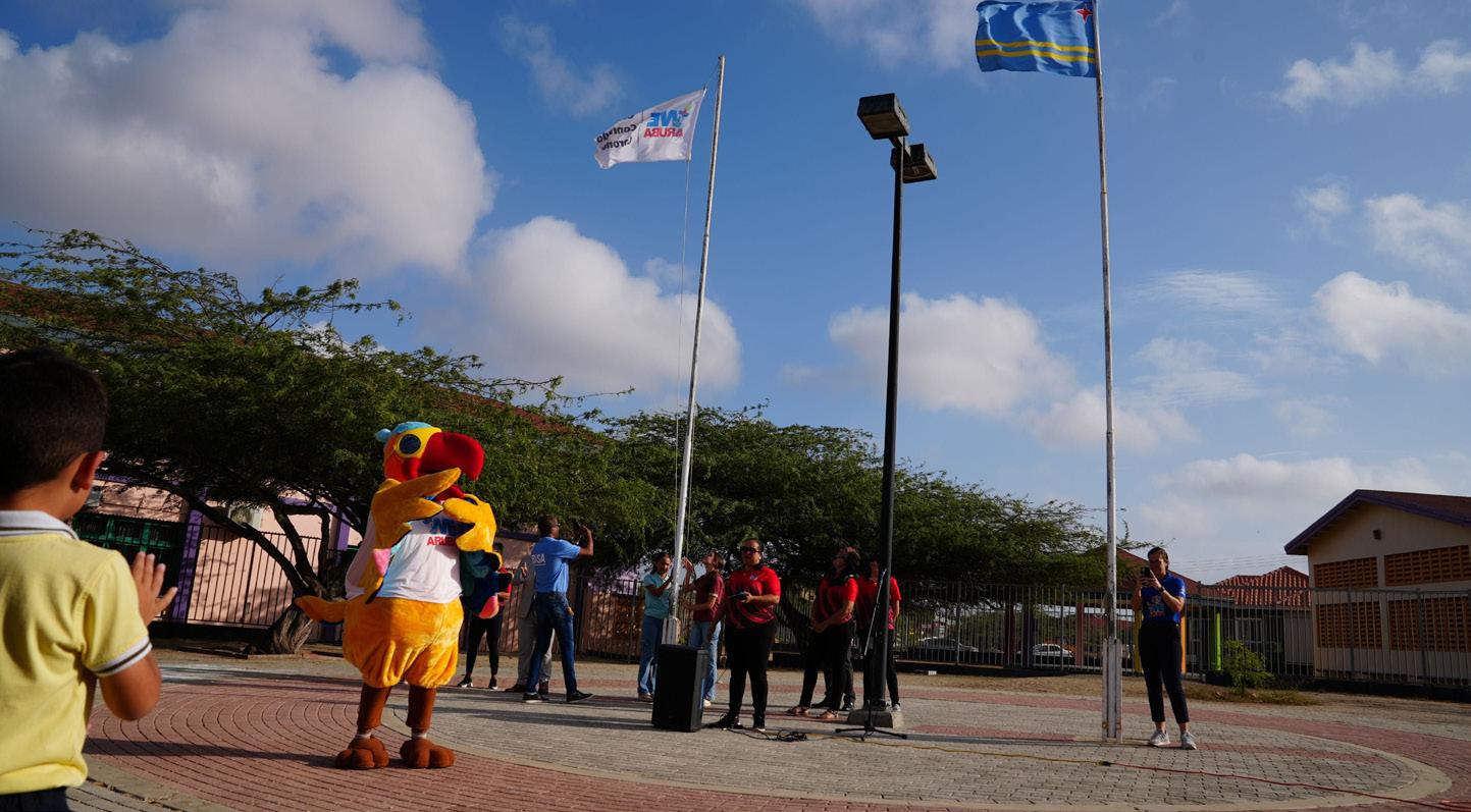 Cabesante di Colegio Conrado Coronel Sra. Lourdes Vries a indica cu tabata un honor cu e scol por a ricibi bishita di Minister Endy Croes. E mandatario di Deporte por a presencia e motivacion cu e scol tin pa Weganan Escolar. Durante e ceremonia, a hisa e bandera y canta e himno di Aruba, a hisa e bandera di Weganan Escolar y a canta e himno di e scol. “E alumno- y maestronan ta hopi motiva pa Weganan Escolar”, Sra. Vries a enfatisa. Alabes Sra. Vries ta desea tur scol hopi exito y specialmente e alumnonan di Colegio Conrado Coronel, boso por, nos ta bay p’e! Pa conclui, Minister Endy Croes ta felicita cabesante, maestro, staf y tur cu a contribui pa haci mainta aki uno bunita y exitoso. Hopi exito na e alumnonan. Cu e deseo, disciplina, dedicacion y determinacion ta logra.