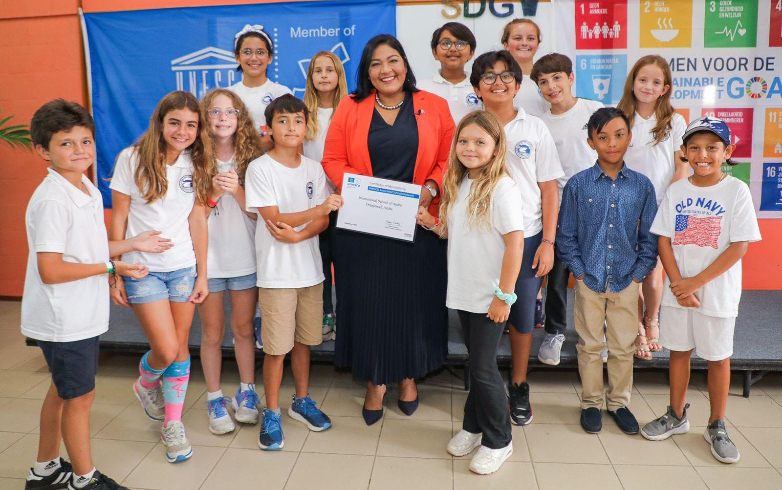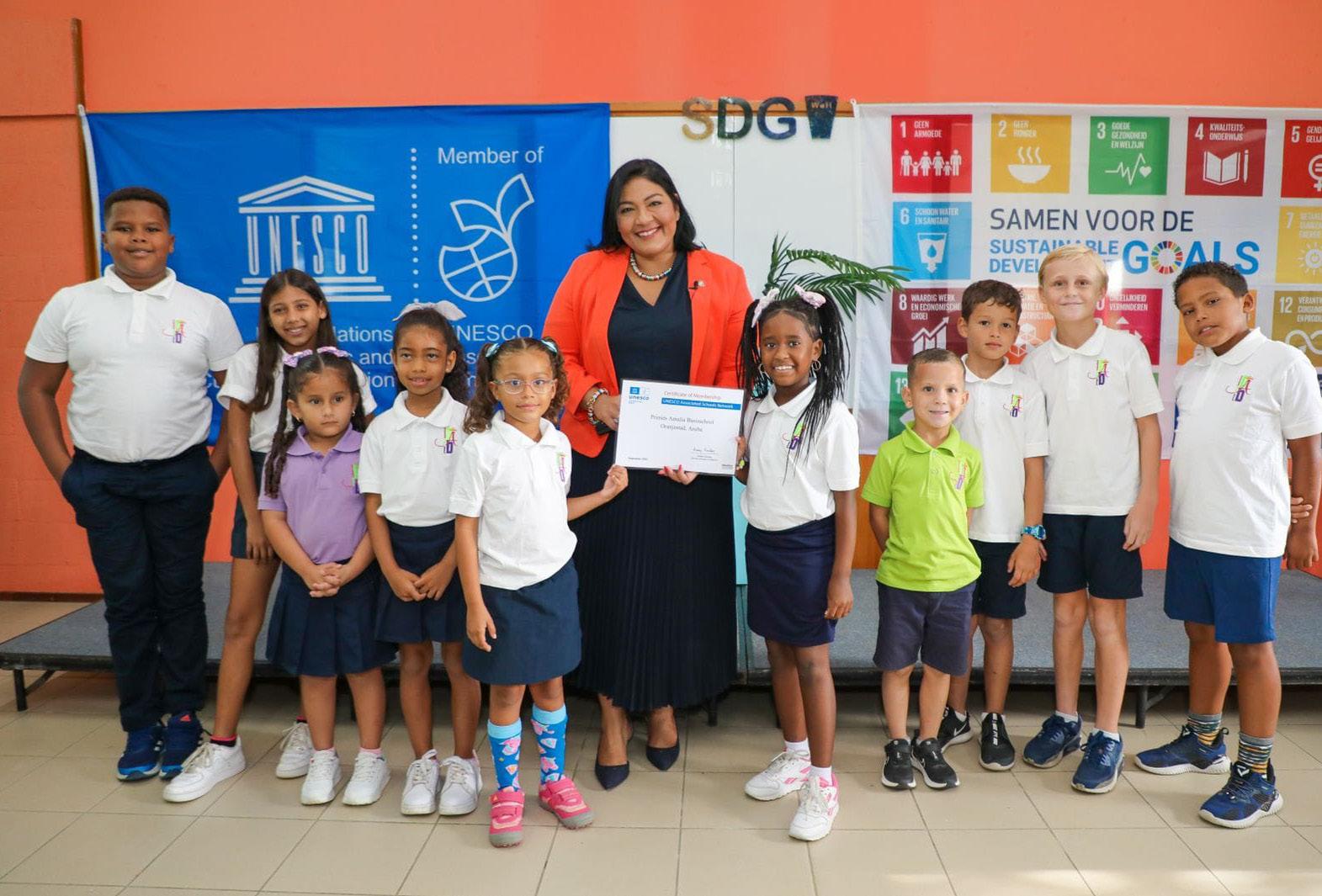 Minister Xiomara Maduro di Cultura tabata presente como Presidente di e Comision Nacional di UNESCO Aruba pa entrega e scolnan nan certificado como Scol di UNESCO. Scolnan di UNESCO ta forma parti di un comunidad global di mas di 12 mil scol rond mundo cu ta reconoci pa nan rol den intercambia, crea y promove un cultura di paz den cual comprension pa diferencia, derechonan humano, cultura y diversidad, afinidad pa ciencia y innovacion y desaroyo sostenibel local y global ta esencial. E hobennan di e Scolnan di UNESCO ta cera conoci cu e 17 metanan mundial di desaroyo sostenibel y ta siña mas di kico mester wordo haci pa yuda Aruba y mundo pa por ta mas sostenibel. Nan ta wordo forma pa bira un cuidadano global.