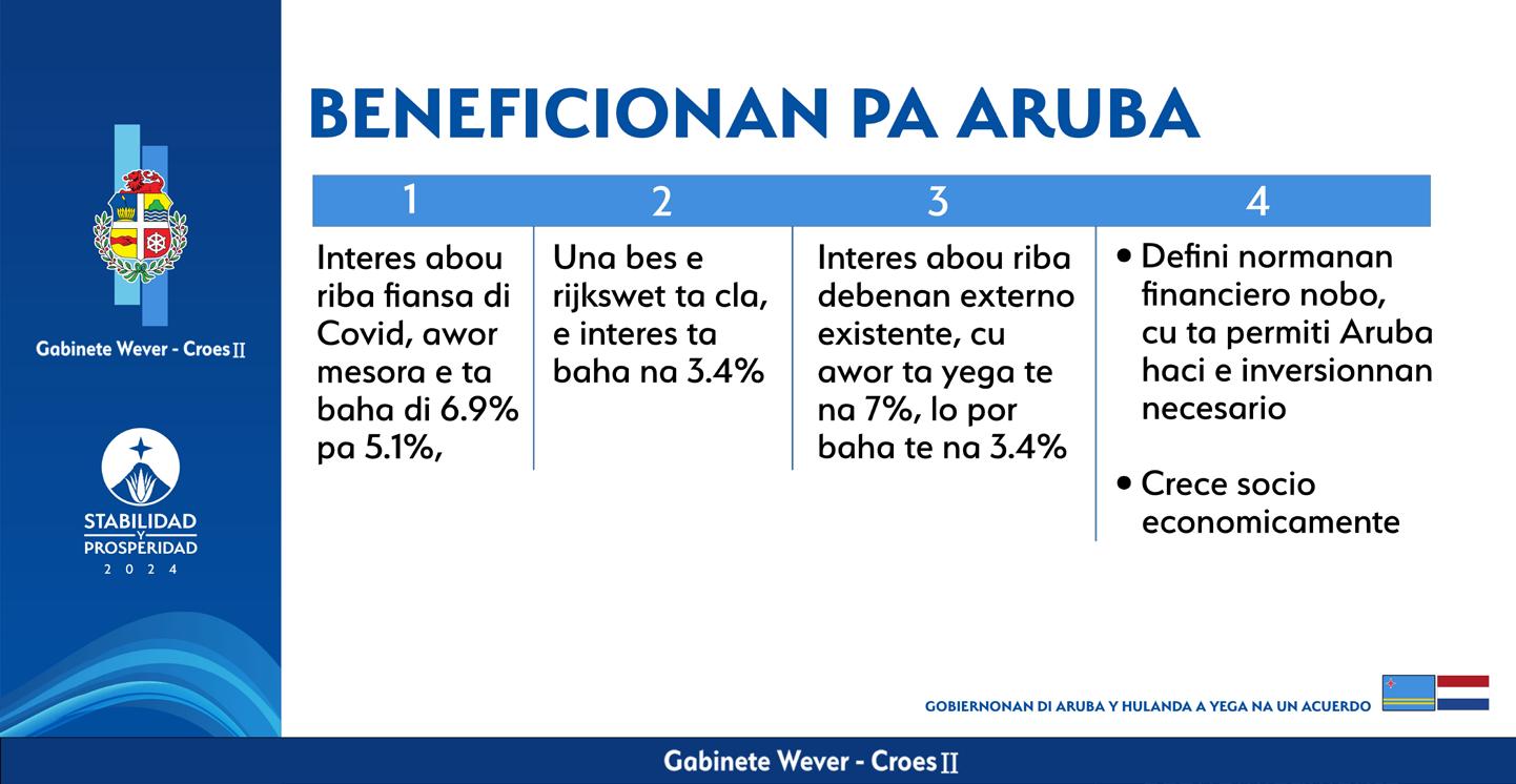 Banda di esaki e Acuerdo entre Aruba y Hulanda ta habri caminda pa asina cu yega na un Ley di Reino, pa por yega na un interes di debe di COVID na 3,4% cu por traduci su mes den 306 miyon florin menos na gasto di interes den e periodo di 20 aña cu mester paga e debe aki bek na Hulanda.