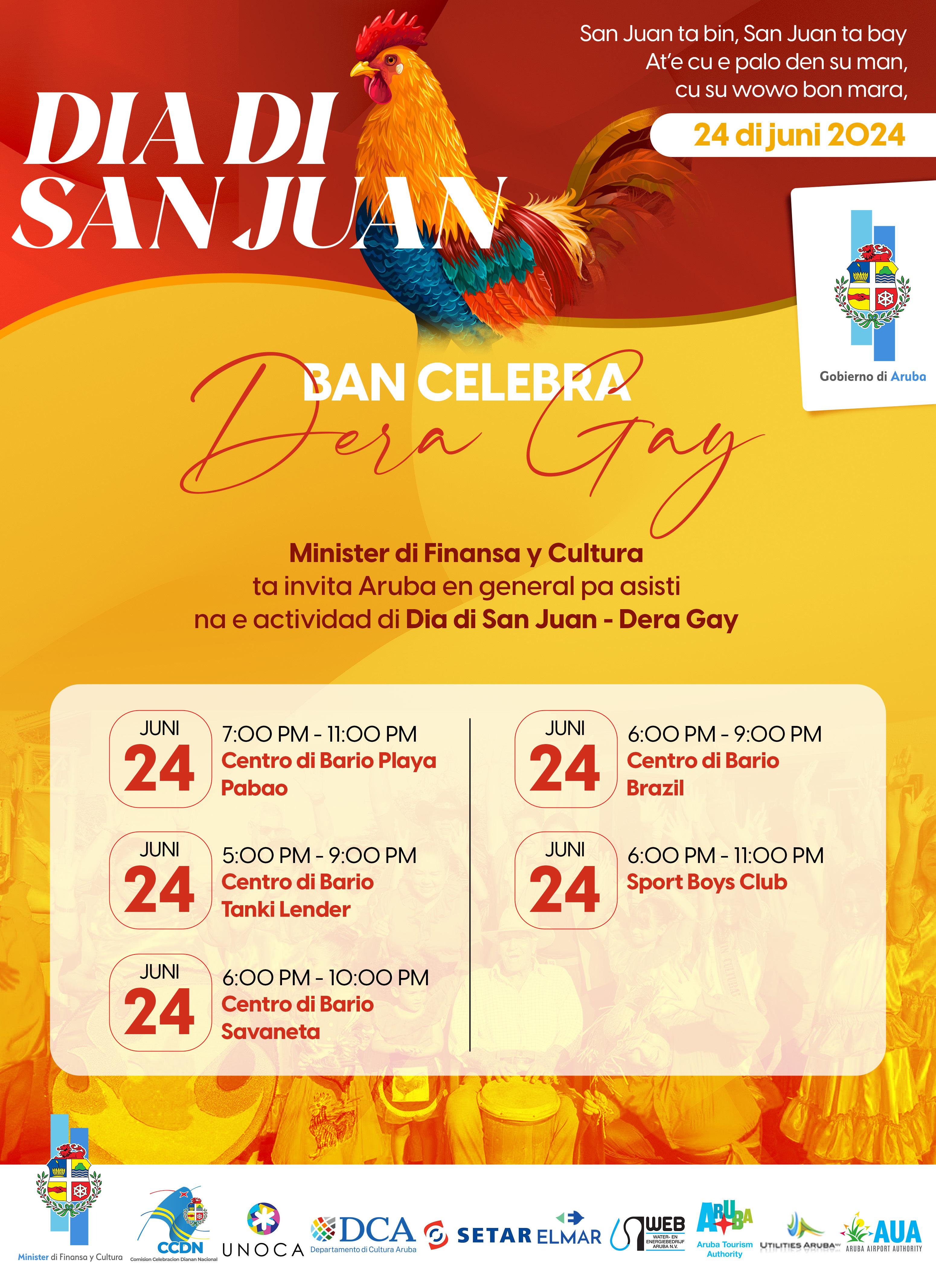 Dialuna siman pasa na Fort Zoutman Minister di Cultura hunto cu Comision Celebracion Dianan Nacional a tene un conferencia di prensa pa informa riba e celebracion di San Juan – Dera Gay 2024. Na e conferencia aki tabata presente Minister di Cultura Xiomara Maduro, Presidente di Comision Celebracion Dianan Nacional Lyonel Dirksz, Representante di UNOCA, di Centro di Bario Savaneta, di Centro di Bario Tanki Lender, di Centro di Bario Playa Pabao, Gucci Dancers y di Sport Boys no por tabata presente. Sr. Lyonel Dirkz, Presidente di Comision Celebracion Dianan Nacional a habri e conferencia y a anuncia e centronan di bario cu tin evento relaciona cu Celebracion di San Juan – Dera Gay 2024. Ela gradici UNOCA cu a duna extra sosten na e centronan pa por celebra e dia di San Juan. Minister di Cultura a elabora riba e tradicion di San Juan, bishitanan cu su persona ta haci na scolnan. Ademas e mandatario a invita un y tur pa bishita e pagina www.coleccion. aw cu tin hopi informacion y historia di e Fiesta di San Juan –Dera Gay. Ademas e mandatario a informa riba su bishita na Cas Tan Tin caminda e por a aprecia e presentacion escolar organisa pa Departamento di Cultura, Cas Tan Tin y Cuerpo di Bombero. Minister Maduro a invita e pueblo pa celebra nos Fiesta di San Juan.